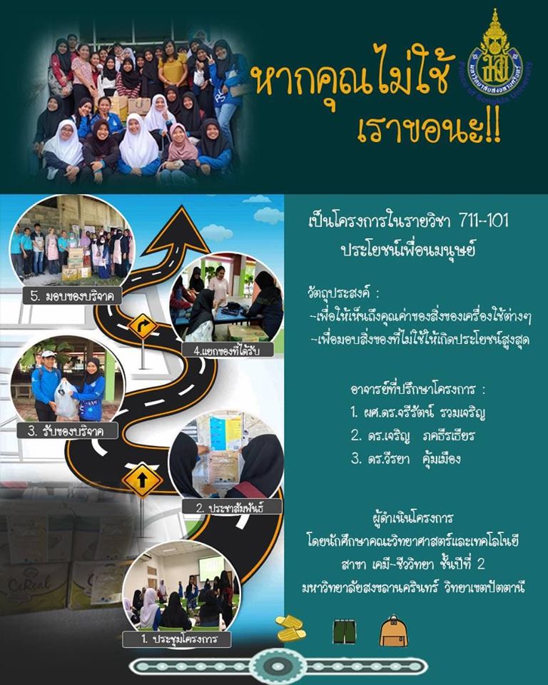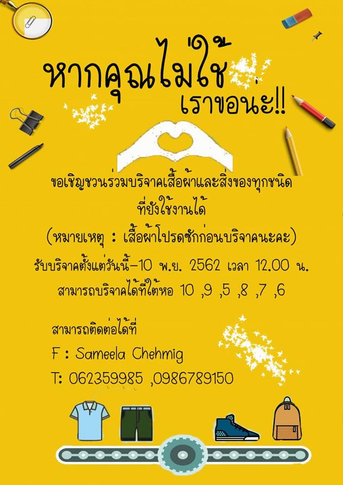 นักศึกษาสาขาวิชาเคมี-ชีววิทยา ชั้นปีที่ 2 จัดโครงการ "หากไม่ใช้ เราขอนะ" เพื่อรับบริจาคสิ่งของ ได้แก่ กระเป๋า เสื้อผ้า เครื่องใช้ ให้ ผอ.สำนักส่งเสริมและการศึกษาต่อเนื่อง (ผศ.ดร.จรีรัตน์ รวมเจริญ) เพื่อนำไปมอบให้กลุ่มแม่บ้านผู้ได้รับผลกระทบจากสถานการณ์ชายแดนใต้และศูนย์เด็กและเยาวชนที่มีปัญหาครอบครัว บ้านน้ำใส ต.ลูโบะยิไร อ.มายอ จ.ปัตตานี เมื่อวันที่ 14 พ.ย. 62 ที่ผ่านมา สำหรับโครงการดังกล่าวเป็นส่วนหนึ่งของรายวิชา 711-101 Benefit of mankinds เพื่อประโยชน์เพื่อมนุษย์