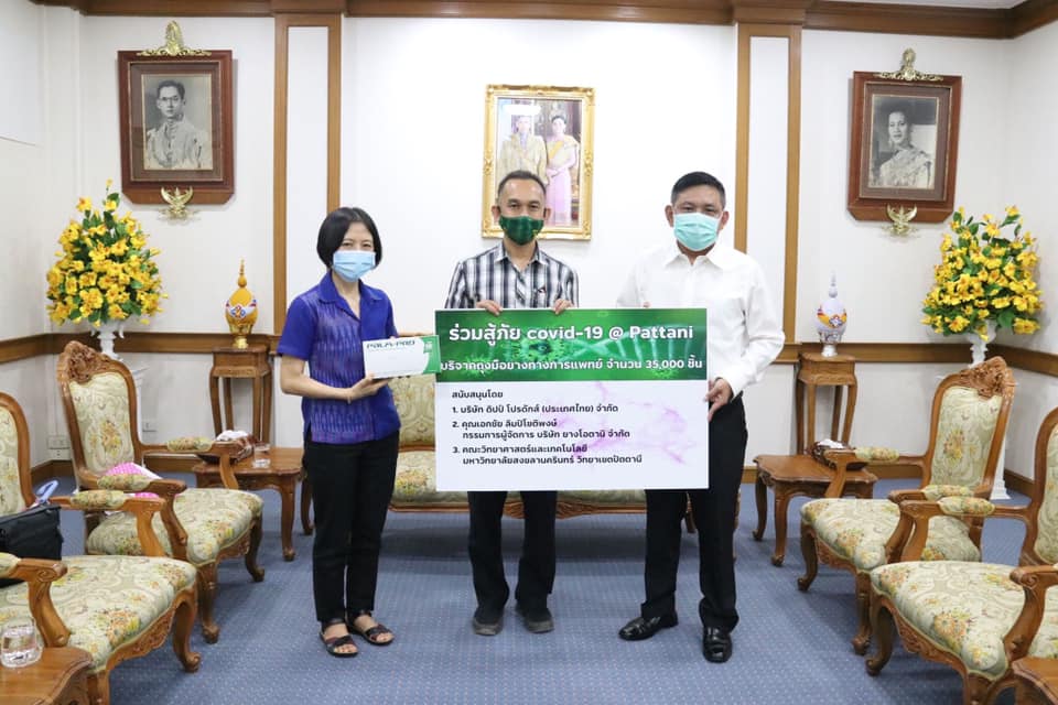 เมื่อวันที่ 10 เม.ย. 63 คณะวิทยาศาสตร์และเทคโนโลยี โดย รศ.ดร.ซุกรี หะยีสาแม ได้นำถุงมือยางทางการแพทย์ จำนวน 35,000 ชิ้น บริจาคผ่านผู้ว่าราชการจังหวัดปัตตานี เพื่อแจกจ่ายให้หน่วยงานในจังหวัดปัตตานีที่มีความต้องการใช้ถุงมือจำนวนมาก สำหรับถุงมือยางดังกล่าวได้รับการสนับสนุนจากเครือข่ายนวัตกรรมยางพารา โดย บริษัท ดิปป์ โปรดักส์ (ประเทศไทย) จำกัด คุณเอกชัย ลิมปิโชติพงษ์ กรรมการผู้จัดการ บริษัท ยางโอตานิ จำกัด ส่วนจำนวนบริจาค 35,000 ชิ้น เปรียบเสมือนการครบรอบ 35 ปี ของการจัดตั้งคณะวิทยาศาสตร์และเทคโนโลยี ม.อ.ปัตตานี