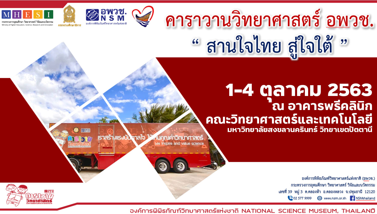 คณะวิทยาศาสตร์และเทคโนโลยี มหาวิทยาลัยสงขลานครินทร์ วิทยาเขตปัตตานี ขอเชิญร่วมกิจกรรมคาราวานวิทยาศาสตร์ อพวช. สานใจไทย สู่ใจใต้" ระหว่างวันที่ 1-4 ตุลาคม 2563 ซึ่งจัดโดยองค์การพิพิธภัณฑ์วิทยาศาสตร์แห่งชาติ (อพวช.) กระทรวงการอุดมศึกษา วิทยาศาสตร์ วิจัย และนวัตกรรม พบกับ นิทรรศการวิทยาศาสตร์แบบสื่อสัมผัส (Hand-on Science Exhibit) นิทรรศการสนุกกับอาชีพวิทย์ (Enjoy Science Careers) กิจกรรมเกมและของเล่นวิทยาศาสตร์ (Science Games and Toys) กิจกรรมมุมนักประดิษฐ์ (Enjoy Maker Space) และกิจกรรมการแสดงทางวิทยาศาสตร์ (Science Show) โดยเข้าชมฟรี ในเวลา 8.30-16.00 น. จำกัดจำนวนผู้เข้าชม เฉพาะการจองล่วงหน้าผ่าน QR Code เท่านั้น สอบถามข้อมูลเพิ่มเติม และจองเข้าชมเป็นหมู่คณะฯ โทร. 025779999 ต่อ 2123
