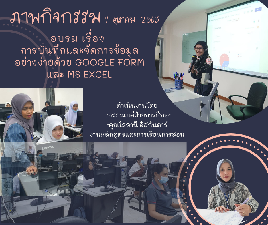 เมื่อวันที่ 7 กันยายน 2563 งานหลักสูตรและการเรียนการสอน คณะวิทยาศาสตร์และเทคโนโลยี ได้จัดกิจกรรมพัฒนาทักษะวิชาการนักศึกษา ประจำปีการศึกษา 2563 เรื่อง การบันทึกและจัดการข้อมูลอย่างง่ายด้วย Google Form และ MS Excel ให้กับนักศึกษาทุกสาขาวิชา โดย ดร.มายือนิง อิสอ อาจารย์ประจำสาขาวิชาคณิตศาสตร์และวิทยาการคอมพิวเตอร์ เป็นวิทยากร