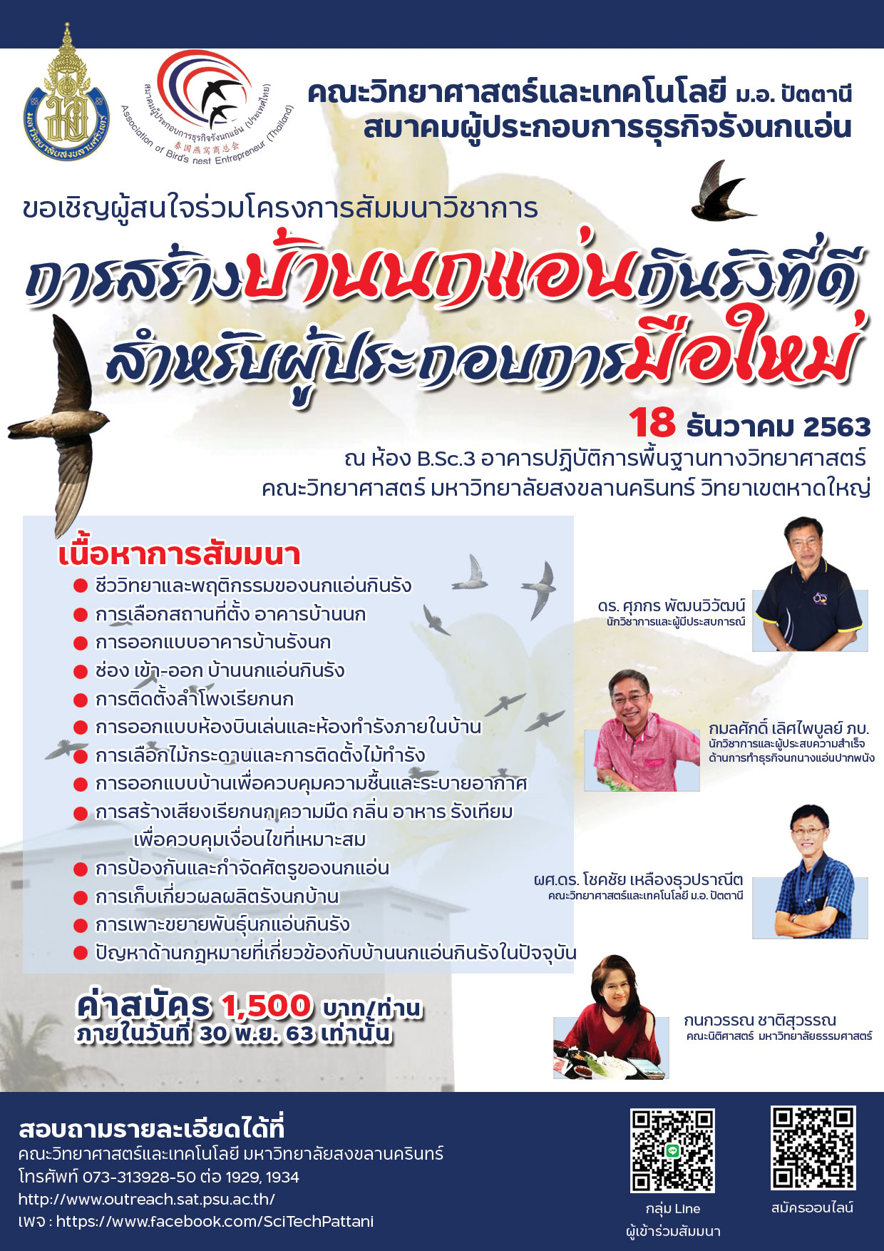 คณะวิทยาศาสตร์และเทคโนโลยี มหาวิทยาลัยสงขลานครินทร์ วิทยาเขตปัตตานี ร่วมกับ สมาคมผู้ประกอบการธุรกิจรังนกแอ่น กำหนดจัดโครงการสัมมนาวิชาการ เรื่อง "การสร้างบ้านนกแอ่นกินรังที่ดีสำหรับผู้ประกอบการมือใหม่" ในวันที่ 18 ธันวาคม 2563 ณ ห้อง B.Sc.3 อาคารปฏิบัติการพื้นฐานทางวิทยาศาสตร์ คณะวิทยาศาสตร์ มหาวิทยาลัยสงขลานครินทร์ วิทยาเขตหาดใหญ่ เพื่อให้ความรู้เกี่ยวกับการสร้างบ้านรังนกแอ่นกินรังเบื้องต้น การอภิปรายและแลกเปลี่ยนความรู้ร่วมกันของนักวิชาการและผู้ประกอบการ อันที่จะนำไปสู่การพัฒนาองค์ความรู้อย่างถูกต้อง ไม่มีผลกระทบต่อสิ่งแวดล้อม และสามารถเก็บเกี่ยวผลผลิตได้อย่างยั่งยืนตลอดไป
