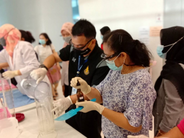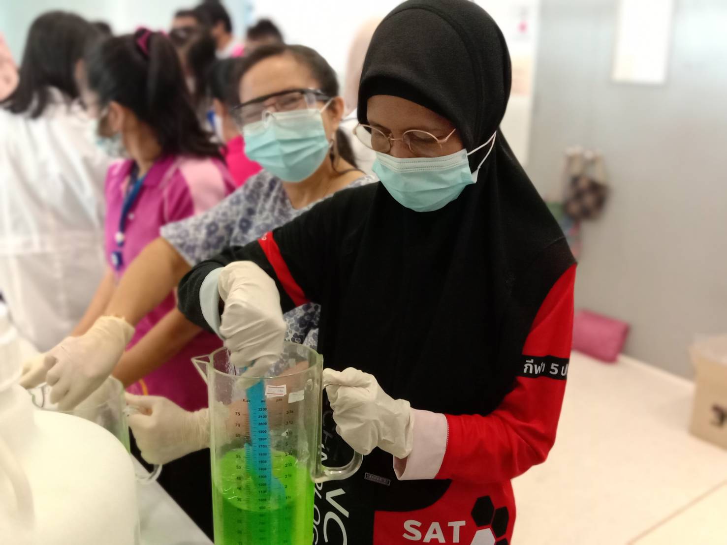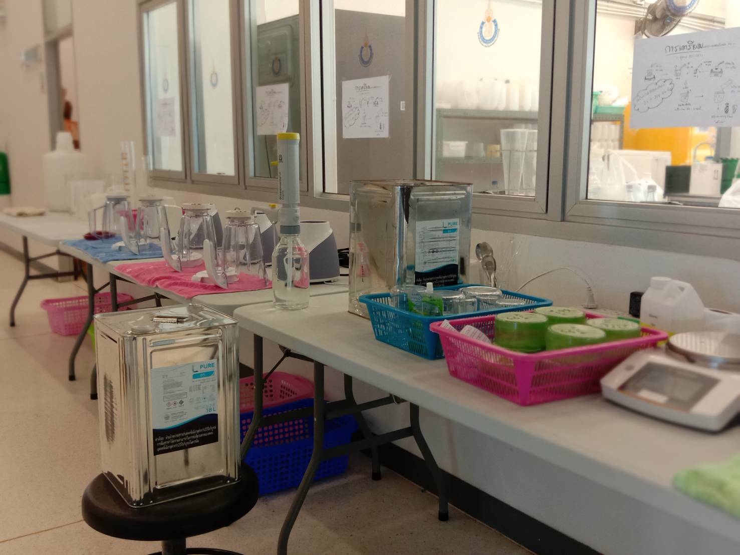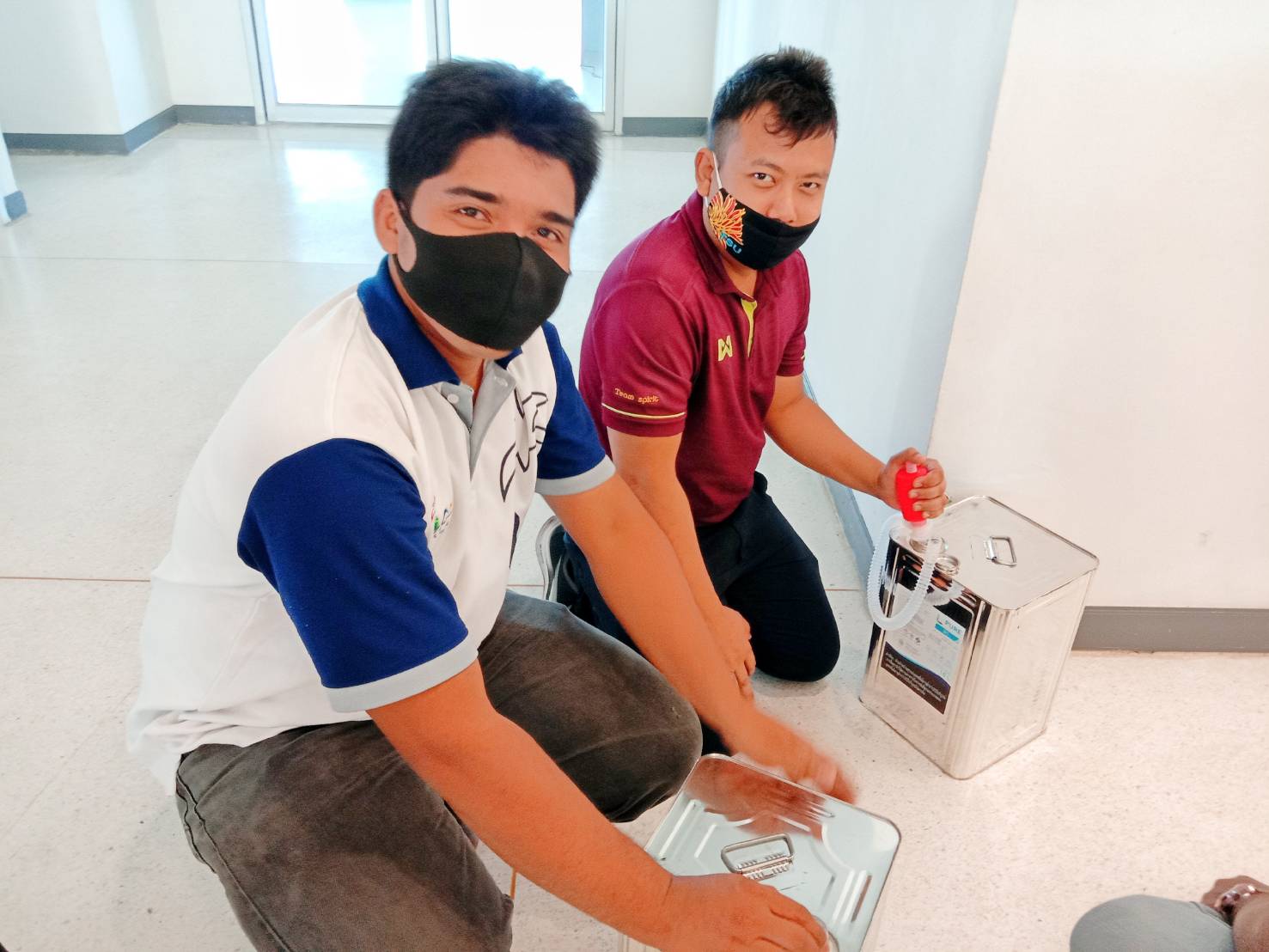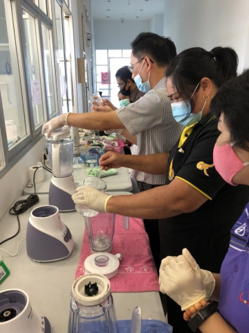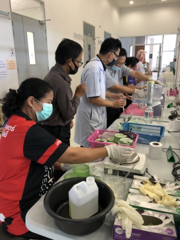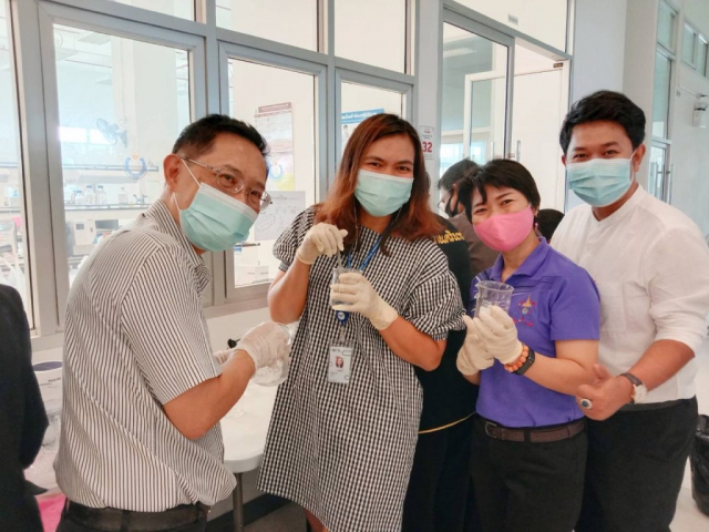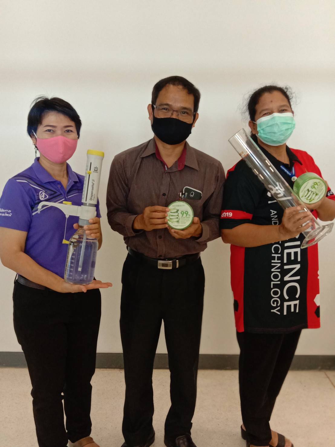 เมื่อวันที่ 29 ธันวาคม 2563 ที่ผ่านมา สำนักงานบริหาร ร่วมกับ ศูนย์เครื่องมือกลาง คณะวิทยาศาสตร์และเทคโนโลยี ร่วมกันผลิตแอลกอฮอล์เหลว 75% สูตร AloGel สำหรับล้างทำความสะอาดมือ (ได้รับอนุสิทธิบัตรแล้ว) ในการผลิตครั้งนี้ ได้ผลผลิตจำนวน 22,000 ซี.ซี. ซึ่งสามารถแบ่งบรรจุใส่ขวดสเปรย์ขนาก 50 ซี.ซี. ได้จำนวน 440 ขวด เพื่อให้บุคลากรของคณะฯ และผู้ที่มาติดต่อได้ใช้ป้องกันเชื้อโรคกันต่อไป