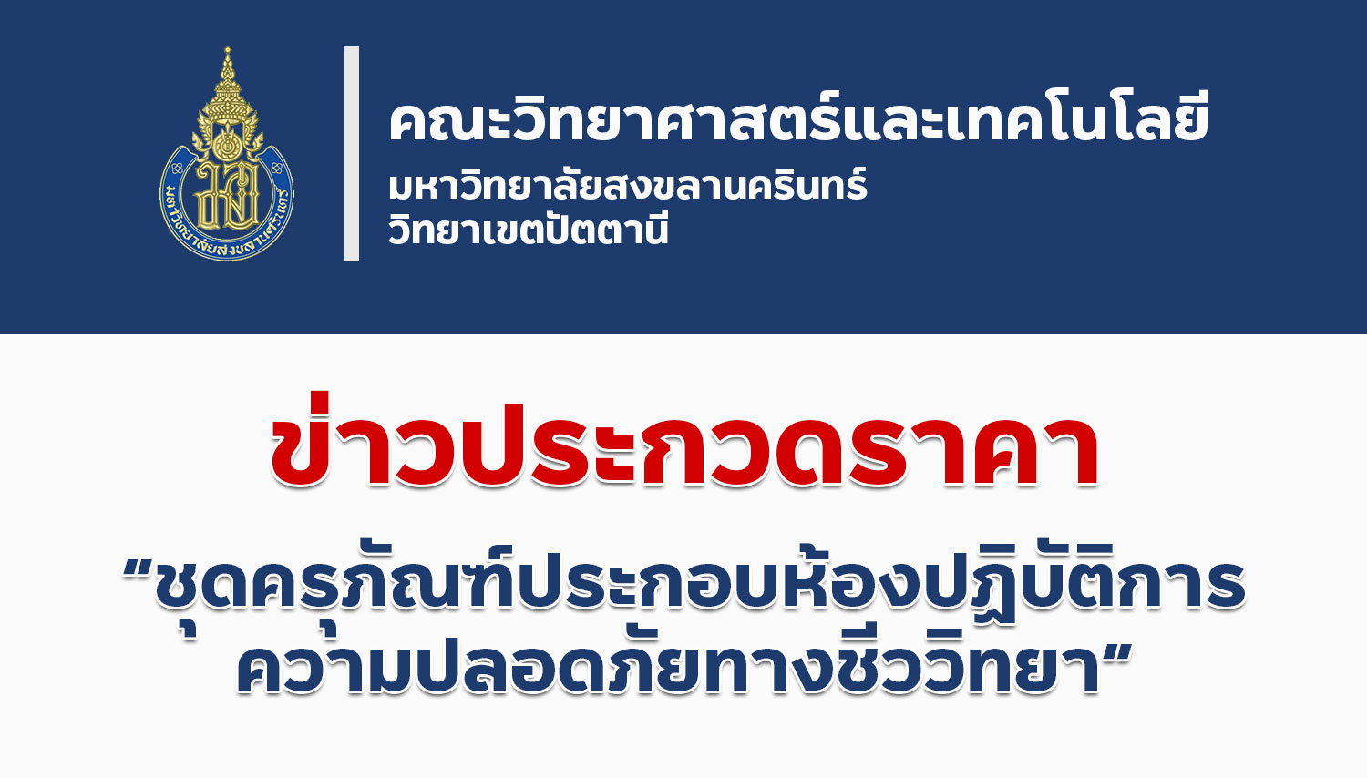 มหาวิทยาลัยสงขลานครินทร์ ประสงค์ประกวดราคาซื้อครุภัณฑ์ประกอบห้องปฏิบัติการความปลอดภัยทางชีววภาพ จำนวน 1 ชุด ด้วยวิธีประกวดราคาอิเล็กทรอนิกส์ (e-bidding) ราคากลางของงานซื้อในการประกวดราคาครั้งนี้ เป็นเงินทั้งสิ้น 1,240,000 บาท ผู้สนใจยื่นข้อเสนอและเสนอราคาทางระบบจัดซื้อจัดจ้างภาครัฐด้วยอิเล็กทรอนิกส์ ในวันที่ 21 กันยายน 2564 เวลา 8.30-16.30 น.