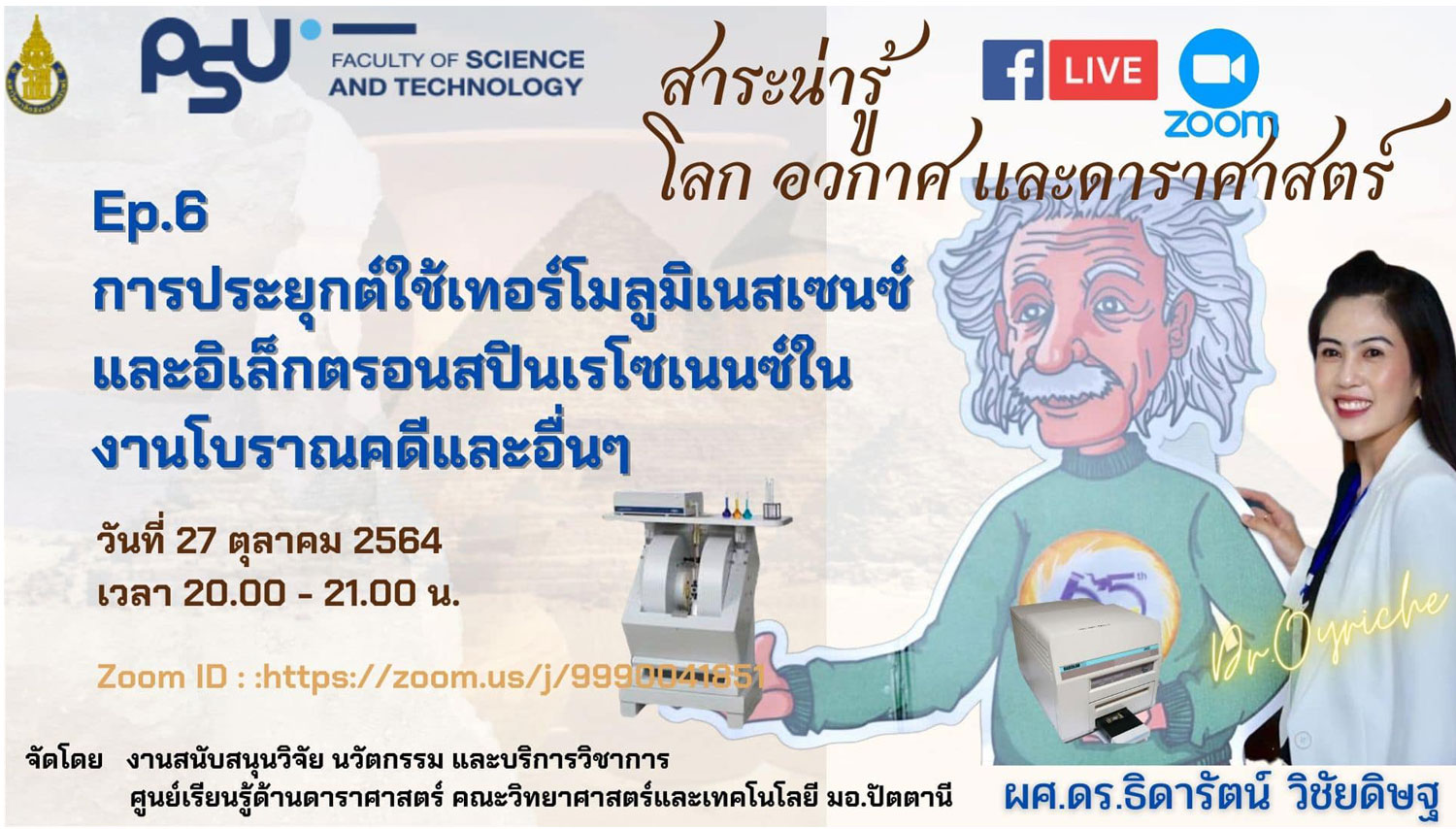 คณะวิทยาศาสตร์และเทคโนโลยี ขอเชิญชมสาระน่ารู้ โลก อวกาศ และดาราศาสตร์ เรื่อง "การประยุกต์ใช้เทอร์โมลูมิเนสเซนซ์ และอิเล็กตรอนสปินเรโซเนนซ์ในงานโบราณคดี และอื่น ๆ" โดย ผศ.ดร.ธิดารัตน์ วิชัยดิษฐ สาขาวิชาวิทยาศาสตร์ ในวันที่ 27 ตุลาคม 2564 เวลา 20.00-21.00 น. โดยสามารถรับชมได้ทาง Zoom ID : https://zoom.us/j/990041851
