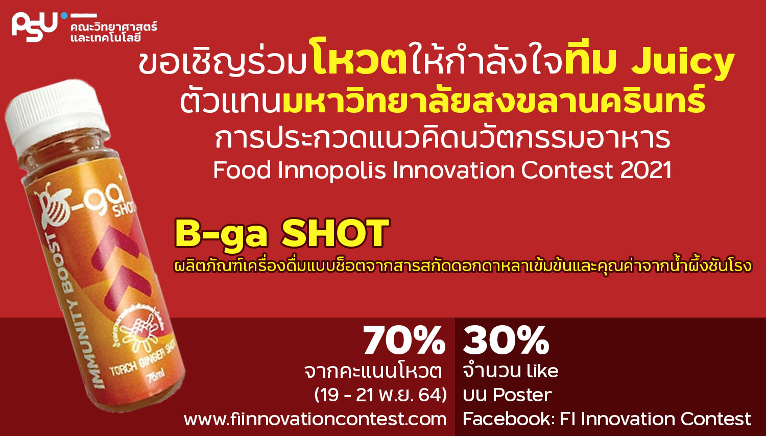 คณะวิทยาศาสตร์และเทคโนโลยี ม.อ. ปัตตานี ขอเชิญร่วมโหวตเป็นกำลังใจให้ทีม Juicy ตัวแทนจากมหาวิทยาลัยสงขลานครินทร์ ให้ได้ รางวัล Popular Vote ในโครงการประกวดแนวคิดนวัตกรรมอาหาร Food Innopolis Innovation Contest 2021 ผลงาน "B-ga SHOT ผลิตภัณฑ์เครื่องดื่มแบบช็อตจากสารสกัดดอกดาหลาเข้มข้นและคุณค่าจากน้ำผึ้งชันโรง" ซึ่งเป็นผลงานนวัตกรรมอาหารแห่งอนาคตของนักวิจัยสาขาวิชาวิทยาศาสตร์การอาหารและโภชนาการ คณะวิทยาศาสตร์และเทคโนโลยี