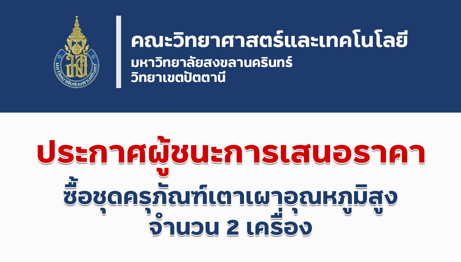 ตามที่มหาวิทยาลัยสงขลานครินทร์ มีโครงการ ซื้อชุดครุภัณฑ์เตาเผาอุณหภูมิสูง จำนวน 2 เครื่อง โดยวิธีเฉพาะเจาะจง ทั้งนี้ผู้ที่ได้รับการคัดเลือก ได้แก่ บริษัท ยู.พี.มาร์เก็ตติ้ง เยนเนอรัล ซัพพลาย จำกัด (ขายส่ง, ขายปลีก, ให้บริการ) โดยเสนอราคาเป็นเงินทั้งสิ้น 400,000 บาท รวมภาษีมูลค่าเพิ่มและภาษาอื่น ค่าขนส่ง ค่าจดทะเบียน และค่าใช้จ่ายอื่น ๆ ทั้งปวง