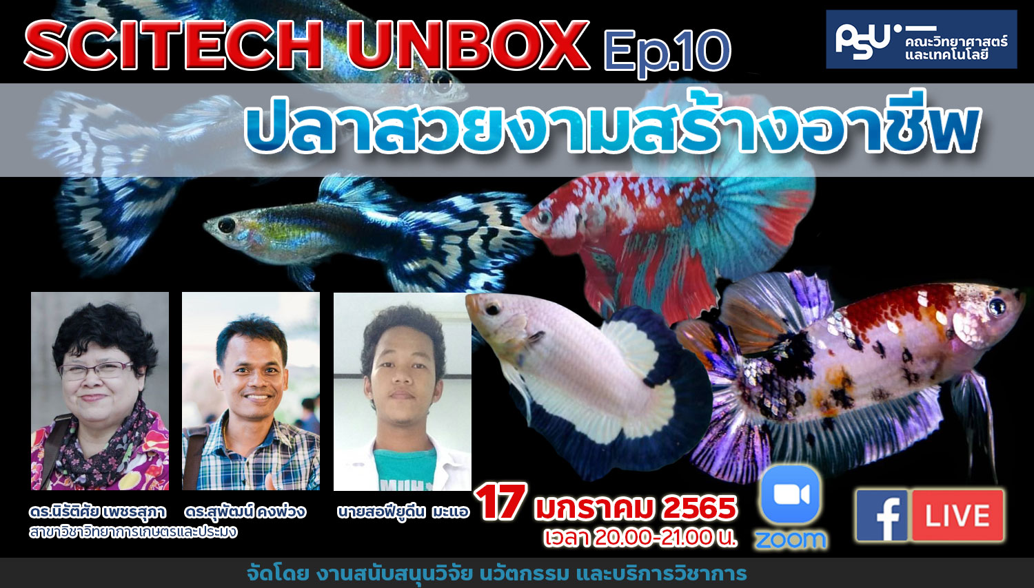 งานสนับสนุนวิจัย นวัตกรรม และบริการวิชาการ คณะวิทยาศาสตร์และเทคโนโลยี ขอเชิญผู้สนใจ ร่วมกิจกรรม SCITECH UNBOX Ep. 10 เรื่อง "ปลาสวยงามสร้างอาชีพ” โดย ดร.นิรัติศัย เพชรสุภา ดร.สุพัฒน์ คงพ่วง นายสอฟียูดีน มะแอ สาขาวิชาวิทยาการเกษตรและประมง ในวันจันทร์ที่ 17 มกราคม 2565 เวลา 20.00-21.00 น. ด้วยระบบออนไลน์ Zoom ID : 999 004 1906 และ Facebook live : https://www.facebook.com/SciTechPattani