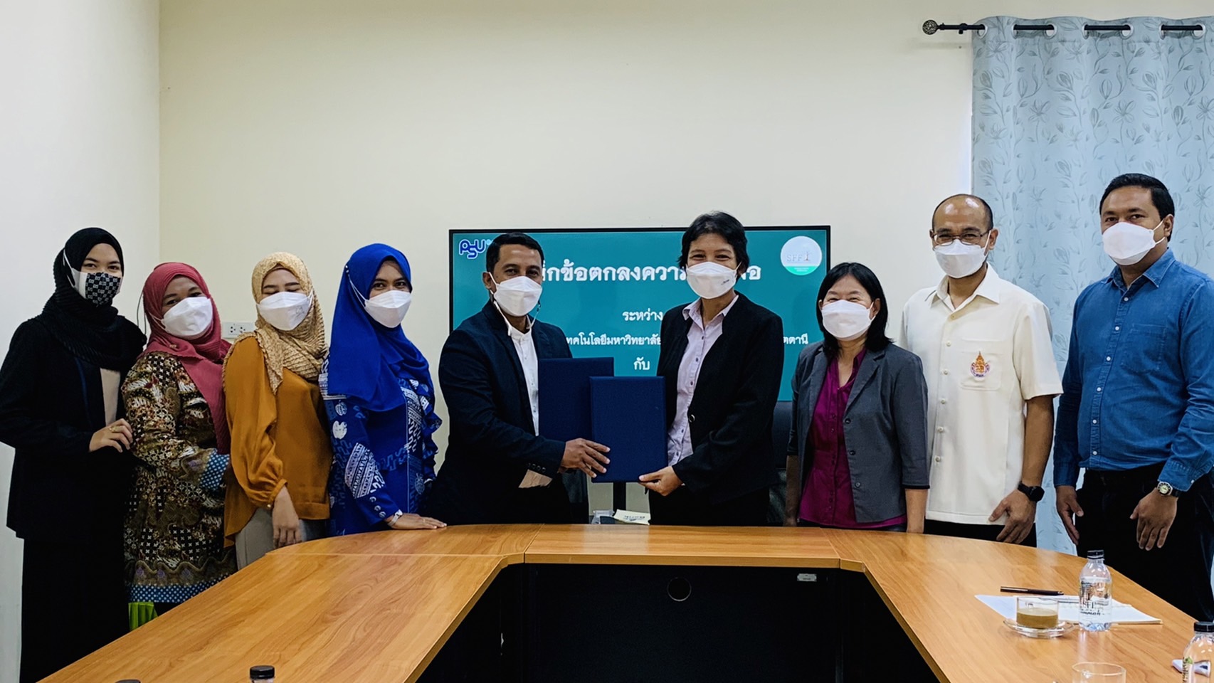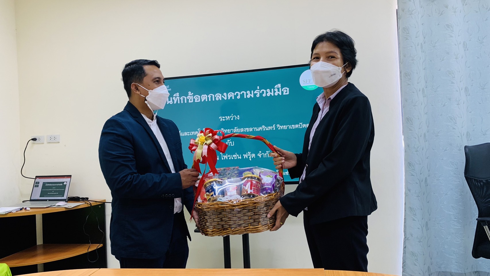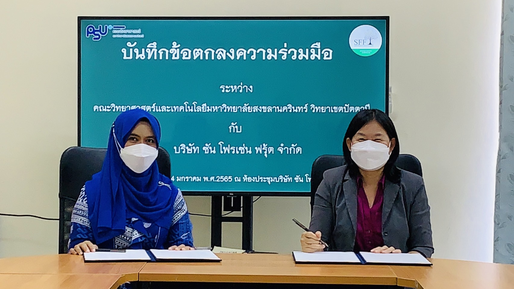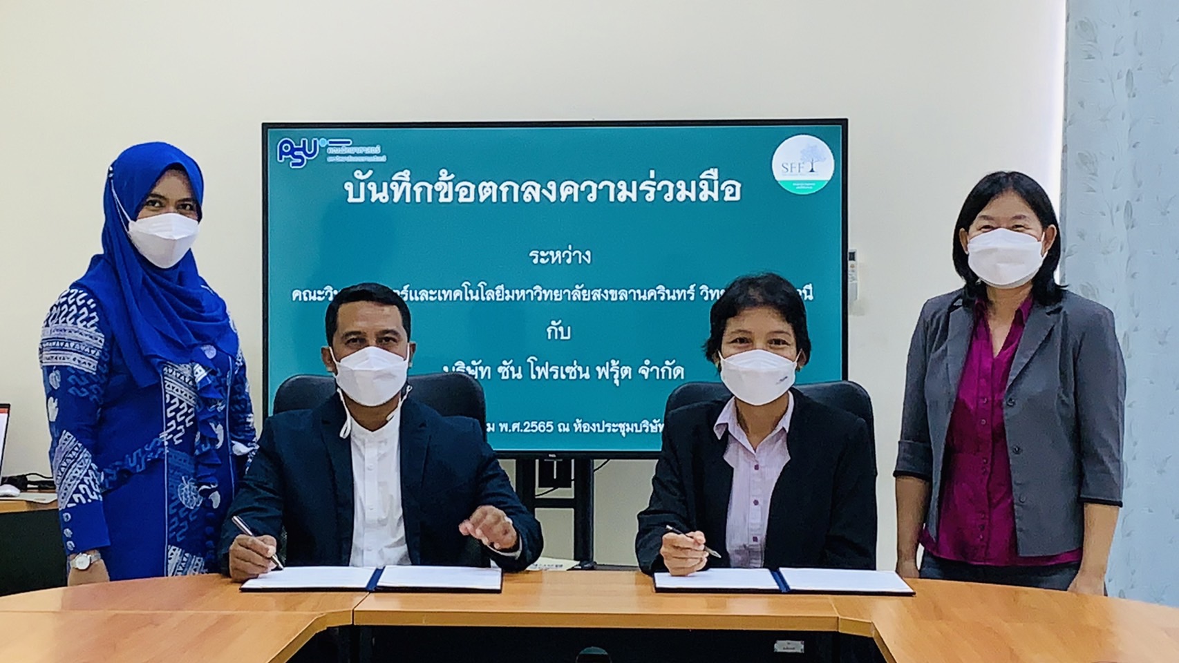 เมื่อวันที่ 14 มกราคม 2565 คณะวิทยาศาสตร์และเทคโนโลยี มหาวิทยาลัยสงขลานครินทร์ วิทยาเขตปัตตานี นำโดย รศ.ดร.กรรณิการ์ สหกะโร คณบดี รศ.ดร.อภิรดี แซ่ลิ่ม รองคณบดีฝ่ายวิจัย นวัตกรรม และบริการวิชาการ อาจารย์ชุมพร หนูเมือง หัวหน้าสาขาวิชาวิทยาศาสตร์การอาหารและโภชนาการ และอาจารย์ภควรรษ ทองนวลจันทร์ ได้เดินทางไปทำบันทึกข้อตกลงความร่วมมือกับ บริษัท ซัน โฟรเซ่น ฟรุ้ต จำกัด จังหวัดนราธิวาส โดย ว่าที่ร้อยตรีเจตน์ มาหามะ ประธานบริษัทฯ ซึ่งเป็นบริษัทที่ทำธุรกิจเกี่ยวกับการผลิตแปรรูปผลไม้แช่แข็งเพื่อจำหน่ายในประเทศและส่งออกต่างประเทศ โดยทั้ง 2 หน่วยงาน มีข้อตกลงตลอดระยะเวลา 3 ปี ในการสร้างความร่วมมือบนพื้นฐานความเข้าใจอันดีต่อกันและประสานผลประโยชน์ในการพัฒนาความรู้ทางวิชาการ พัฒนาการศึกษา ความมั่นคงในด้านเกษตรกรรม และอุตสาหกรรมเกษตร รวมถึงความร่วมมือในการนำผลผลิตทางการเกษตรมาวิจัยและพัฒนาเป็นผลิตภัณฑ์อาหารที่ได้มาตรฐาน อันจะเป็นการช่วยส่งเสริมการบริโภคผลิตภัณฑ์อาหารจากผลผลิตทางการเกษตรที่มีคุณภาพต่อไป