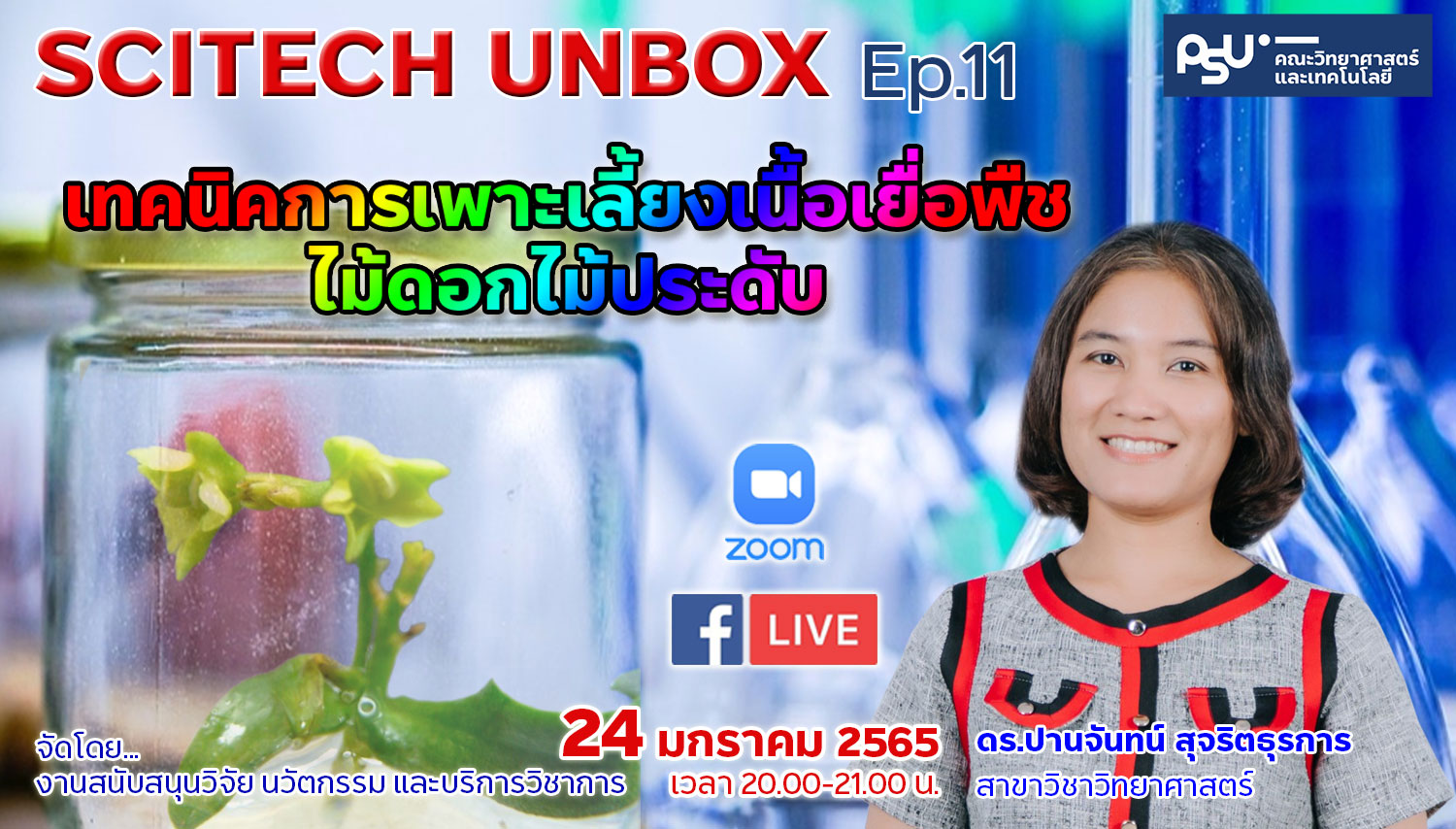 งานสนับสนุนวิจัย นวัตกรรม และบริการวิชาการ คณะวิทยาศาสตร์และเทคโนโลยี ขอเชิญผู้สนใจ ร่วมกิจกรรม SCITECH UNBOX Ep. 11 เรื่อง "เทคนิคการเพาะเลี้ยงเนื้อเยื่อพืชไม้ดอกไม้ประดับ” โดย ดร.ปานจันทน์ สุจริตธุรการ สาขาวิชาวิทยาศาสตร์ ในวันจันทร์ที่ 24 มกราคม 2565 เวลา 20.00-21.00 น. ด้วยระบบออนไลน์ Zoom ID : 999 004 1906 และ Facebook live : https://www.facebook.com/SciTechPattani