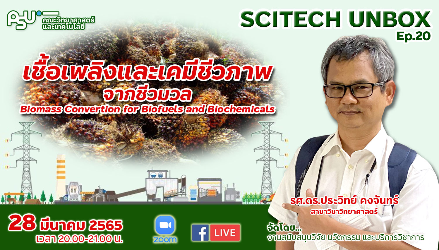 งานสนับสนุนวิจัย นวัตกรรม และบริการวิชาการ คณะวิทยาศาสตร์และเทคโนโลยี ขอเชิญผู้สนใจ ร่วมกิจกรรม SCITECH UNBOX Ep. 20 เรื่อง “เชื้อเพลิงและเคมีชีวภาพจากชีวมวล Biomass Convertion for Biofuels and Biochemicals” โดย รศ.ดร.ประวิทย์ คงจันทร์ สาขาวิชาวิทยาศาสตร์ ในวันจันทร์ที่ 28 มีนาคม 2565 เวลา 20.00-21.00 น. ด้วยระบบออนไลน์ Zoom ID : 999 004 1906 และ Facebook live : https://www.facebook.com/