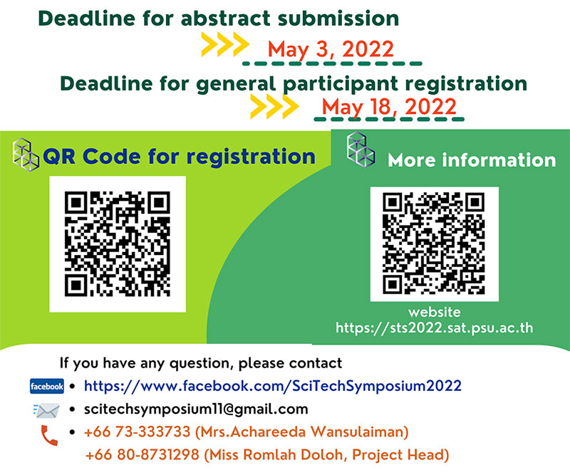 คณะวิทยาศาสตร์และเทคโนโลยี ขอเชิญผู้สนใจเข้าร่วมงานประชุมวิชาการ Sci-Tech Symposium ครั้งที่ 11 รูปแบบออนไลน์ ในวันที่ 25 พ.ค. 2565 โดยเป็นการนำเสนอผลงานวิจัยในรูปแบบ oral presentation และ Poster presentation ของนักศึกษาระดับปริญญาตรี-โท-เอก และนักศึกษาในสถาบันต่างประเทศ ผู้สนใจเข้าร่วมงานสามารถอ่านรายละเอียดเพิ่มเติมได้ที่ https://sts2022.sat.psu.ac.th