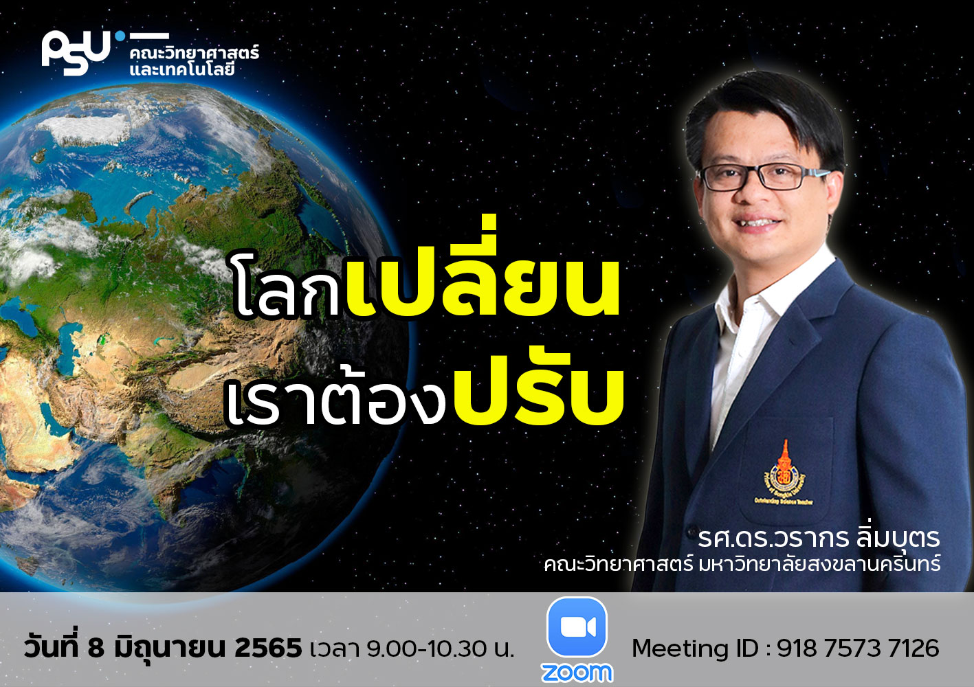 - เวลา 09.00 น. บรรยาย หัวข้อ “โลกเปลี่ยน เราต้องปรับ” โดย รองศาสตราจารย์ ดร.วรากร ลิ่มบุตร สังกัดคณะวิทยาศาสตร์ มหาวิทยาลัยสงขลานครินทร์