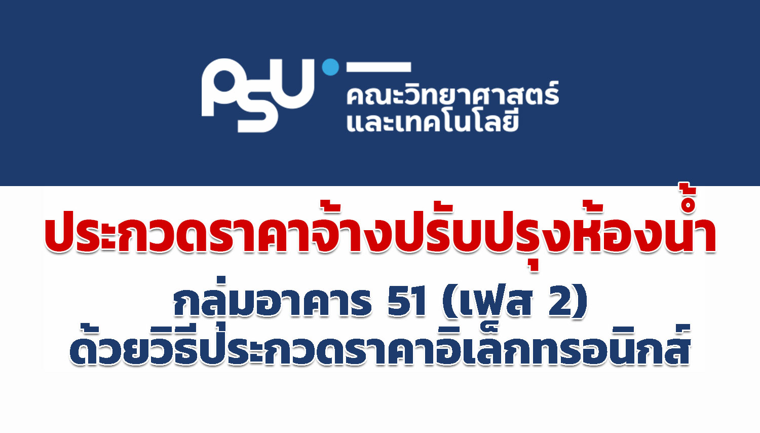 มหาวิทยาลัยสงขลานครินทร์ ประสงค์จะประกวดราคาจ้างปรับปรุงห้องน้ำกลุ่มอาคาร 51 (เฟส 2) คณะวิทยาศาสตร์และเทคโนโลยี จำนวน 1 งาน ด้วยวิธีประกวดราคาอิเล็กทรอนิกส์ (E-bidding) ราคากลางของงานจ้างในการประกวดราคาครั้งนี้เป็นเงินทั้งสิ้น 1,199,000 บาท ผู้สนใจสามารถติดต่อขอยื่นข้อเสนอและเสนอราคาภายในวันที่ 10 มิถุนายน 2565 ในเวลาราชการ