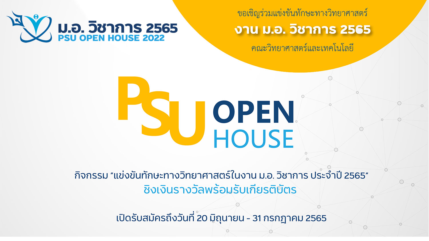 คณะวิทยาศาสตร์และเทคโนโลยี มหาวิทยาลัยสงขลานครินทร์ วิทยาเขตปัตตานี ขอเชิญชวนนักเรียนระดับประถมศึกษา และมัธยมศึกษา เข้าร่วมการแข่งขันทักษะทางวิทยาศาสตร์ ในงาน ม.อ. วิชาการ ประจำปี 2565 ชิงเงินรางวัลและเกียรติบัตร ในวันที่ 18 สิงหาคม 2565 โดยจัดการแข่งขัน 2 กิจกรรม ได้แก่ การประกวดสิ่งประดิษฐ์วิทยาศาสตร์ และการประกวดโครงงานวิทยาศาสตร์ ผู้สนใจส่งผลงานเข้าประกวดสามารถสมัครได้ที่ http://openhouse.sat.psu.ac.th/ หรือสอบถามรายละเอียดเพิ่มเติมได้ที่ คุณพนิดา แซ่ตั้ง โทร. 083-897-7169
