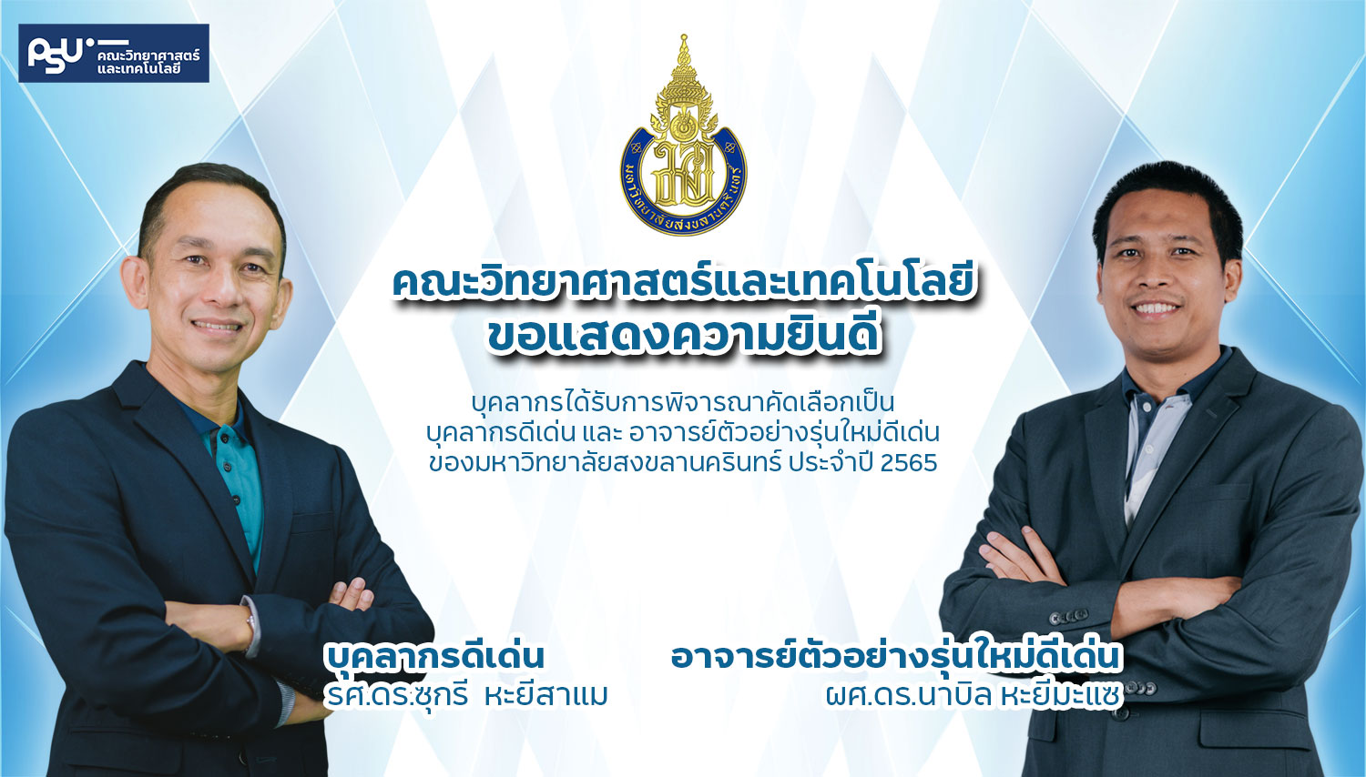 คณะวิทยาศาสตร์และเทคโนโลยี ขอแสดงความยินดีกับบุคลากรของคณะฯ ได้รับการคัดเลือกเป็นบุคลากรดีเด่น และอาจารย์ตัวอย่างรุ่นใหม่ดีเด่น ของมหาวิทยาลัยสงขลานครินทร์ ประจำปี 2565 จำนวน 2 ท่าน ได้แก่