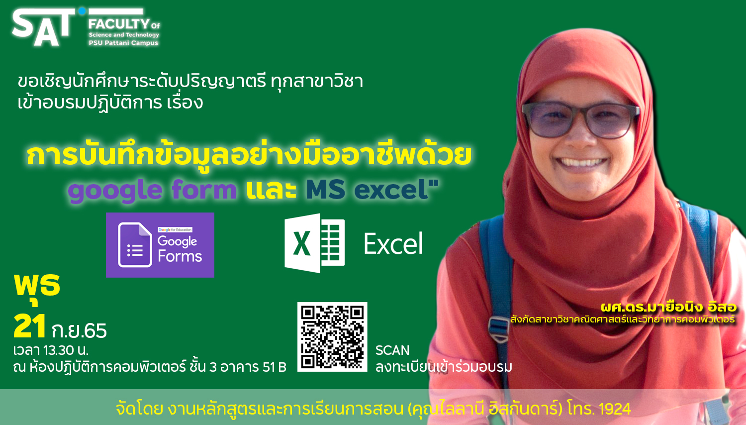 หน่วยหลักสูตรและการเรียนการสอน คณะวิทยาศาสตร์และเทคโนโลยี ขอเชิญนักศึกษาระดับปริญญาตรี ทุกสาขาวิชา เข้าร่วมโครงการอบรมเชิงปฏิบัติการ เรื่อง "การบันทึกข้อมูลอย่างมืออาชีพด้วย google form และ MS excel" ในวันพุธ ที่ 21 กันยายน 2565 เวลา 13.30 น. ณ ห้องปฏิบัติการคอมพิวเตอร์ ชั้น 3 อาคาร 51 B วิทยากรโดย ผศ.ดร.มายือนิง อิสอ สังกัดสาขาวิชาคณิตศาสตร์และวิทยาการคอมพิวเตอร์ ผู้สนใจสมัครได้ที่ https://forms.gle/bVMrcxoKag9QD87N8 หรือสอบถามรายละเอียดได้ที่คุณไลลานี อิสกันดาร์ โทร. 1924