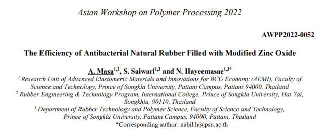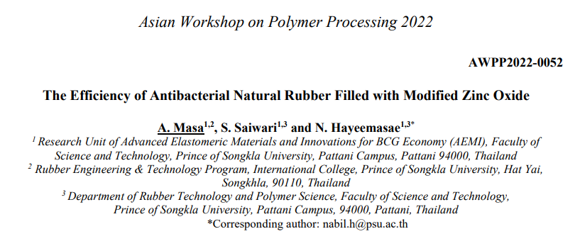 ผศ.ดร.ซิตีไซยีดะห์ สายวารี และ ผศ.ดร.นาบิล หะยีมะแซ คณาจารย์สาขาวิชาเทคโนโลยียางและพอลิเมอร์ คณะวิทยาศาสตร์และเทคโนโลยี ได้รับเชิญเป็น Invited speaker ในการประชุมวิชาการนานาชาติ "The 19th Asian Workshop on Polymer Processing" ระหว่างวันที่ 5-7 October 2022, ณ Langkawi, Malaysia. โดยเป็นผลงานจากงานวิจัยที่ได้รับทุน FF ปี 2565