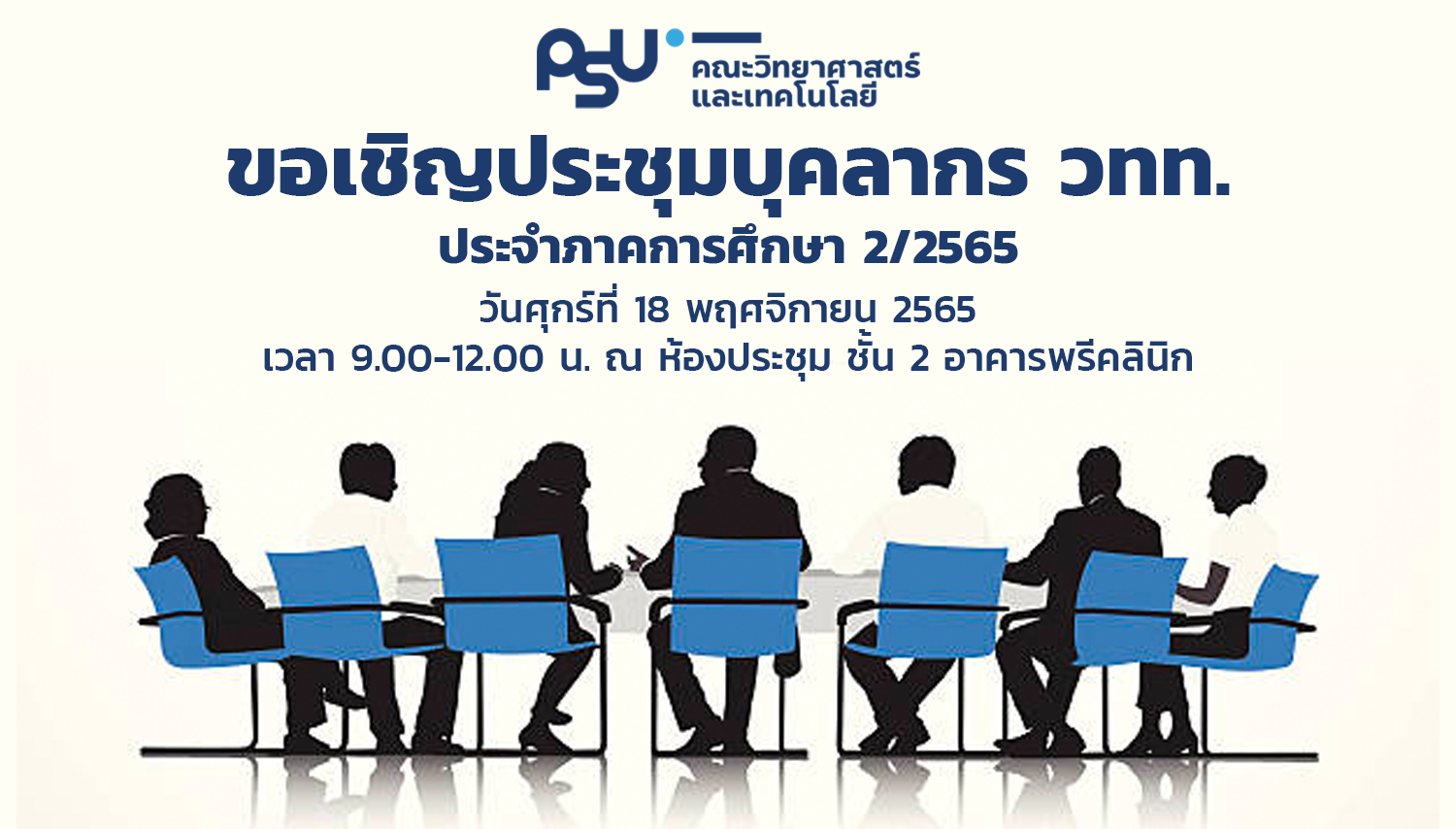 คณะวิทยาศาสตร์และเทคโนโลยี ขอเชิญบุคลากร วทท. ประชุมบุคลากร ประจำภาคการศึกษาที่ 2/2565 ในวันศุกร์ที่ 18 พฤศจิกายน 2565 เวลา 09.00-12.00 น. ณ ห้องประชุม 2 ชั้น 2 อาคารพรีคลินิก เพื่อรับฟังนโยบายการบริหารงานของคณะฯ และเพื่อเตรียมการก่อนเปิดภาคการศึกษา
