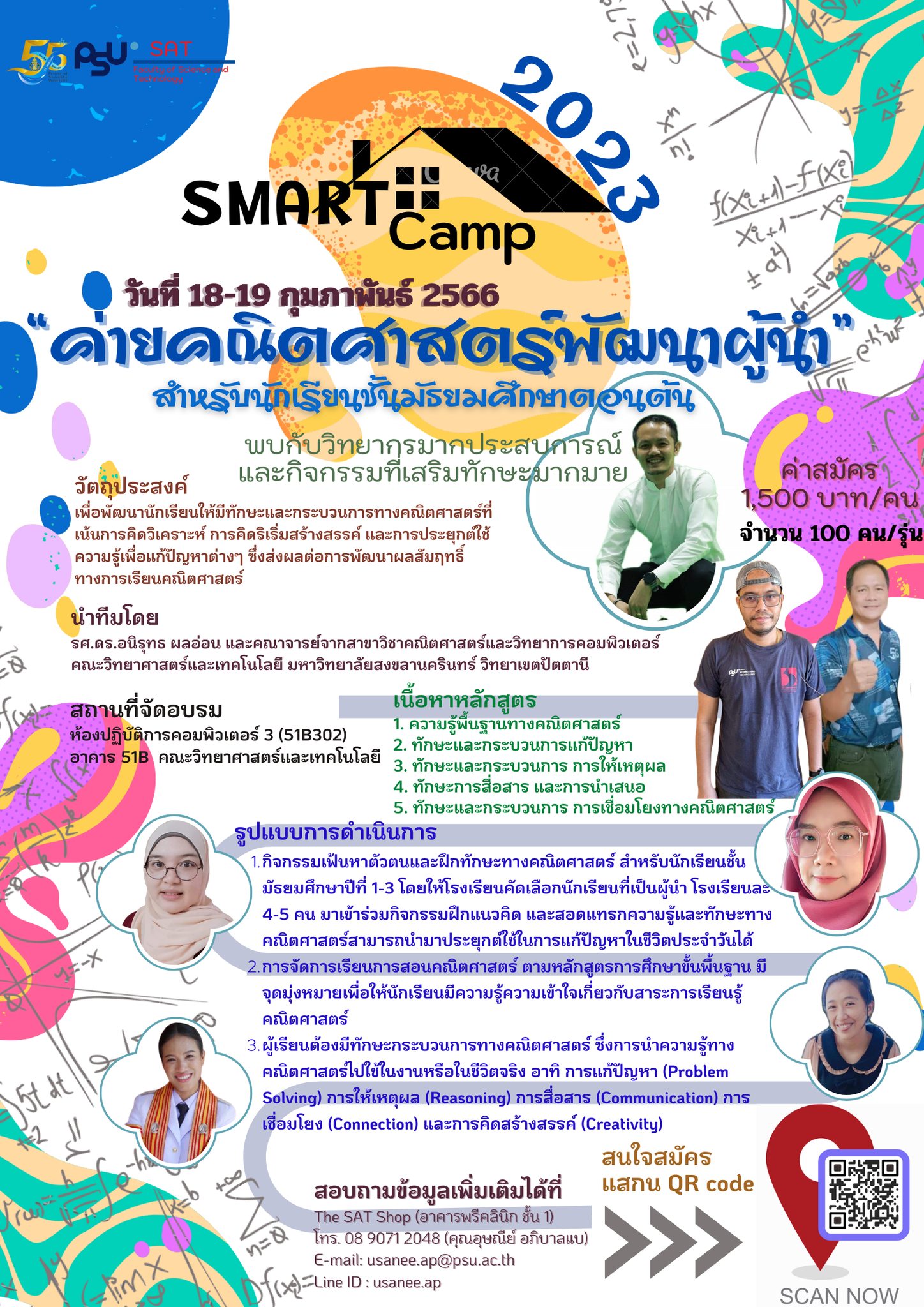 คณะวิทยาศาสตร์และเทคโนโลยี มหาวิทยาลัยสงขลานครินทร์ วิทยาเขตปัตตานี ขอเชิญนักเรียนชั้นมัธยมศึกษาปีที่ 1-3 เข้าร่วมโครงการ “ค่ายคณิตศาสตร์พัฒนาผู้นำ” เพื่อพัฒนาทักษะและกระบวนการทางคณิตศาสตร์ที่เน้นการคิดวิเคราะห์ การคิดริเริ่มสร้างสรรค์ และการประยุกต์ใช้ความรู้เพื่อแก้ปัญหาต่างๆ ซึ่งส่งผลต่อการพัฒนาผลสัมฤทธิ์ทางการเรียนคณิตศาสตร์