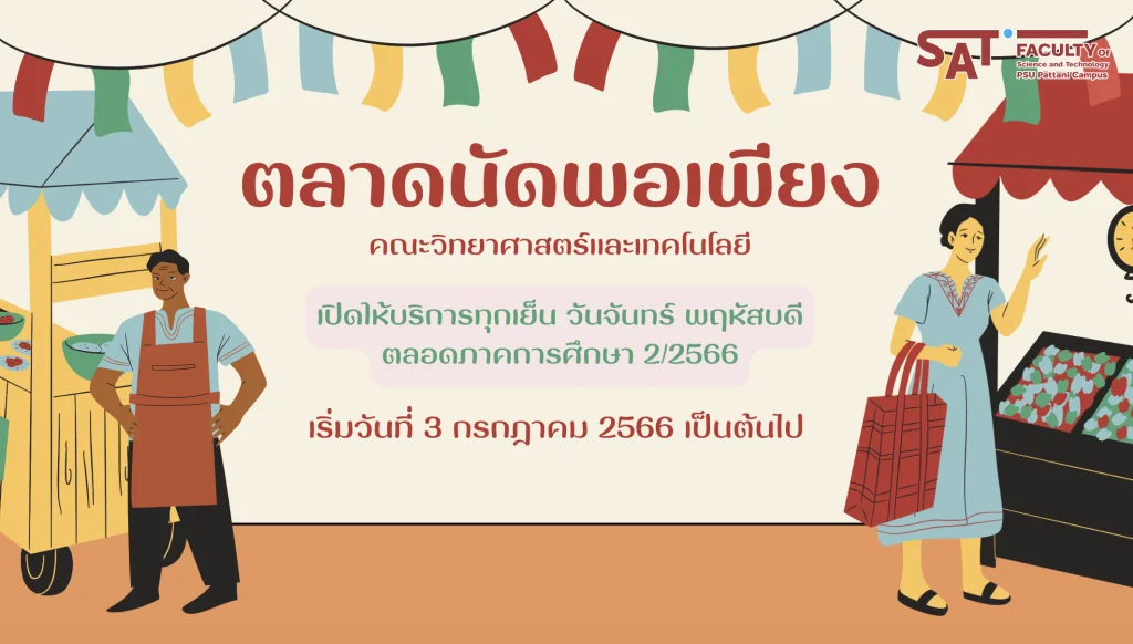 คณะวิทยาศาสตร์และเทคโนโลยี กำหนดเปิดให้บริการตลาดนัดพอเพียง ทุกเย็นวันจันทร์และพฤหัสบดี ตลอดปีการศึกษา 2/2566 ณ บริเวณสี่แยกหน้าอาคาร 51 โดยเริ่มตั้งแต่วันที่ 3 ก.ค. 66 เป็นต้นไป จึงขอเชิญผู้สนใจเลือกซื้อผลิตภัณฑ์ของนักศึกษา และชาวบ้านในพื้นที่ ได้ตามวัน เวลา ดังกล่าว