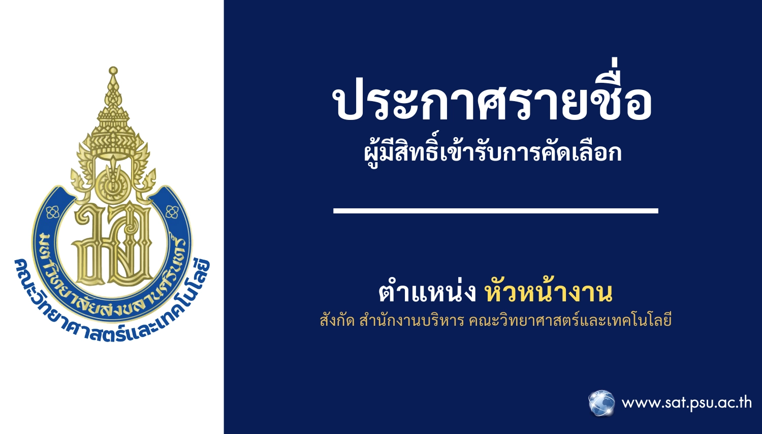 คณะวิทยาศาสตร์และเทคโนโลยี ประกาศรายชื่อผู้มีสิทธิ์เข้ารับการคัดเลือกตำแหน่งหัวหน้างาน สังกัดสำนักงานบริหาร คณะวิทยาศาสตร์และเทคโนโลยี โดยกำหนดนำเสนอแนวคิดและสอบสัมภาษณ์ วันที่ 29 กันยายน 66 และกำหนดส่งผลงาน/แผนงาน/โครงการในการพัฒนาหน่วยงาน มายังหน่วยพัฒนาทรัพยากรมนุษย์ ภายในวันที่ 25 กันยายน 2566