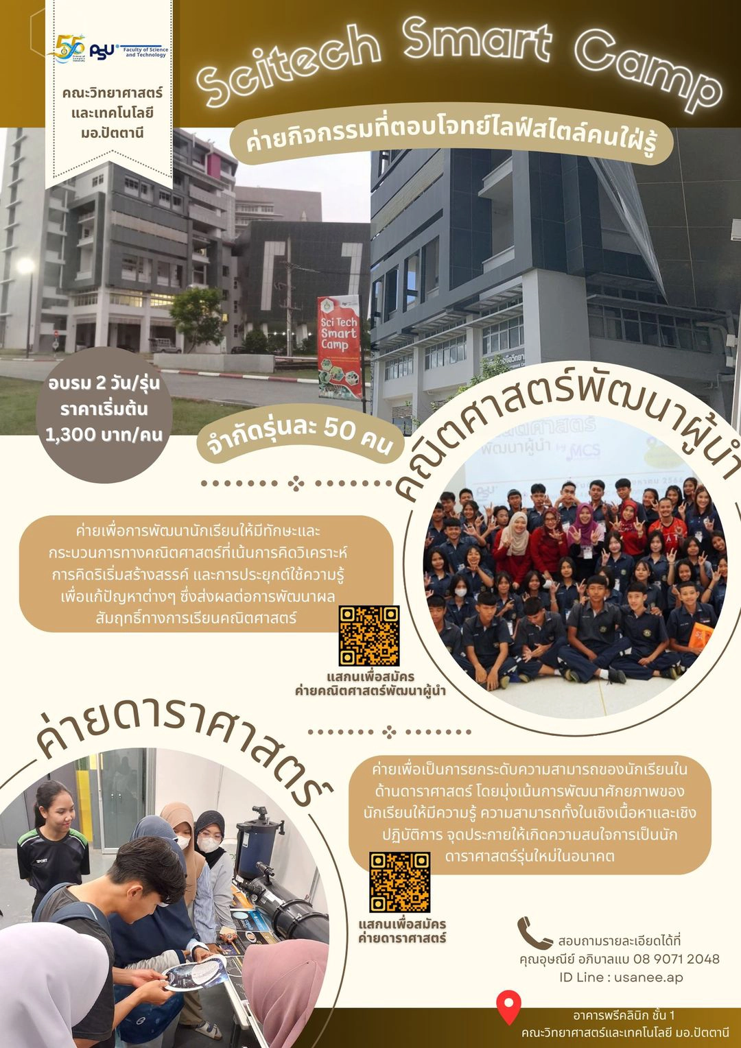 คณะวิทยาศาสตร์และเทคโนโลยี รับสมัครนักเรียนที่สนใจร่วมกิจกรรม SciTech Smart Camp ในช่วงปิดภาคการศึกษา จำนวน 2 โครงการ ได้แก่ โครงการ "คณิตศาสตร์พัฒนาผู้นำ" เพื่อพัฒนานักเรียนให้มีทักษะกระบวนการทางคณิตศาสตร์ที่เน้นการคิดวิเคราะห์ สร้างสรรค์ และประยุกต์ใช้เพื่อแก้ปัญหาต่าง ๆ และ โครงการ "ค่ายดาราศาสตร์" เพื่อยกระดับความสามารถนักเรียนในด้านดาราศาสตร์ และจุดประกายนักเรียนให้เป็นนักดาราศาสตร์รุ่นใหม่ในอนาคต ผู้สนใจสามารถสมัครเป็นหมู่คณะฯ หรือสอบถามรายละเอียดได้ที่ คุณอุษณีย์ อภิบาลแบ โทร.0890712048 ID line : usanee.ap