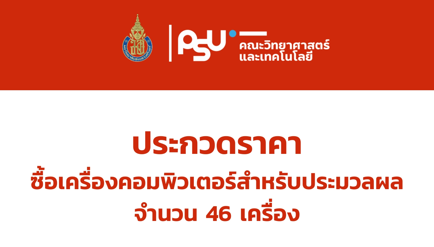 มหาวิทยาลัยสงขลานครินทร์ วิทยาเขตปัตตานี มีความประสงค์จะประกวดราคาซื้อเครื่องคอมพิวเตอร์ สำหรับประมวลผล 46 เครื่อง ด้วยวิธีประกวดราคาอิเล็กทรอนิกส์ (e-bidding) ราคากลางของงานซื้อในการประกวดราคาครั้งนี้ เป็นเงินทั้งสิ้น 1,104,000.- บาท (หนึ่งล้านหนึ่งแสนสี่พันบาทถ้วน) ผู้สนใจยื่นข้อเสนอและเสนอราคาทางระบบจัดซื้อจัดจ้างภาครัฐด้วยอิเล็กทรอนิกส์ www.gprocurement.go.th ในวันที่ 6 พฤศจิกายน 2566 ระหว่างเวลา 13.00-16.00 น.