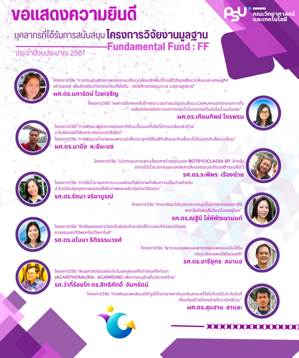 คณะวิทยาศาสตร์และเทคโนโลยี ขอแสดงความยินดีกับบุคลากรของคณะฯ ในการที่สำนักวิจัยและพัฒนา ได้พิจารณาสนับสนุนโครงการวิจัยงานมูลฐาน (Fundamental Fund : FF) ประจำปีงบประมาณ 2567