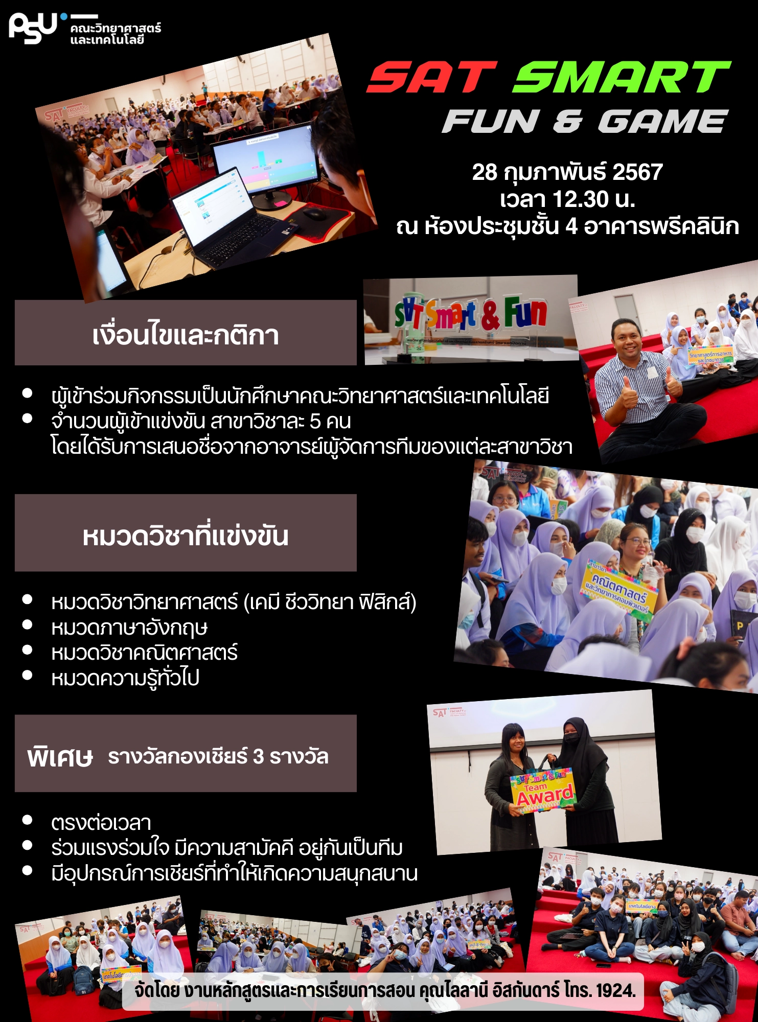 งานหลักสูตรและการเรียนการสอน คณะวิทยาศาสตร์และเทคโนโลยี ขอเชิญผู้สนใจเข้าร่วมกิจกรรม SAT SMART FUN & GAME ประจำปีการศึกษา 2566 ซึ่งเป็นการแข่งขันทักษะวิชาการของนักศึกษาระดับปริญญาตรีทุกชั้นปีของคณะวิทยาศาสตร์และเทคโนโลยี โดยใช้โปรแกรม kahoot ใน 4 หมวดวิชา ได้แก่ หมวดวิชาวิทยาศาสตร์ (เคมี ชีววิทยา ฟิสิกส์) หมวดภาษาอังกฤษ หมวดคณิตศาสตร์ และหมวดความรู้ทั่วไป รวมทั้งการประกวดกองเชียร์ของแต่ละหลักสูตร ในวันพุธ ที่ 28 กุมภาพันธ์ 2567 เวลา 12.30 น. ณ ห้องประชุมชั้น 4 อาคารพรีคลินิกคณะฯ ชิงเงินรางวัล ดังนี้