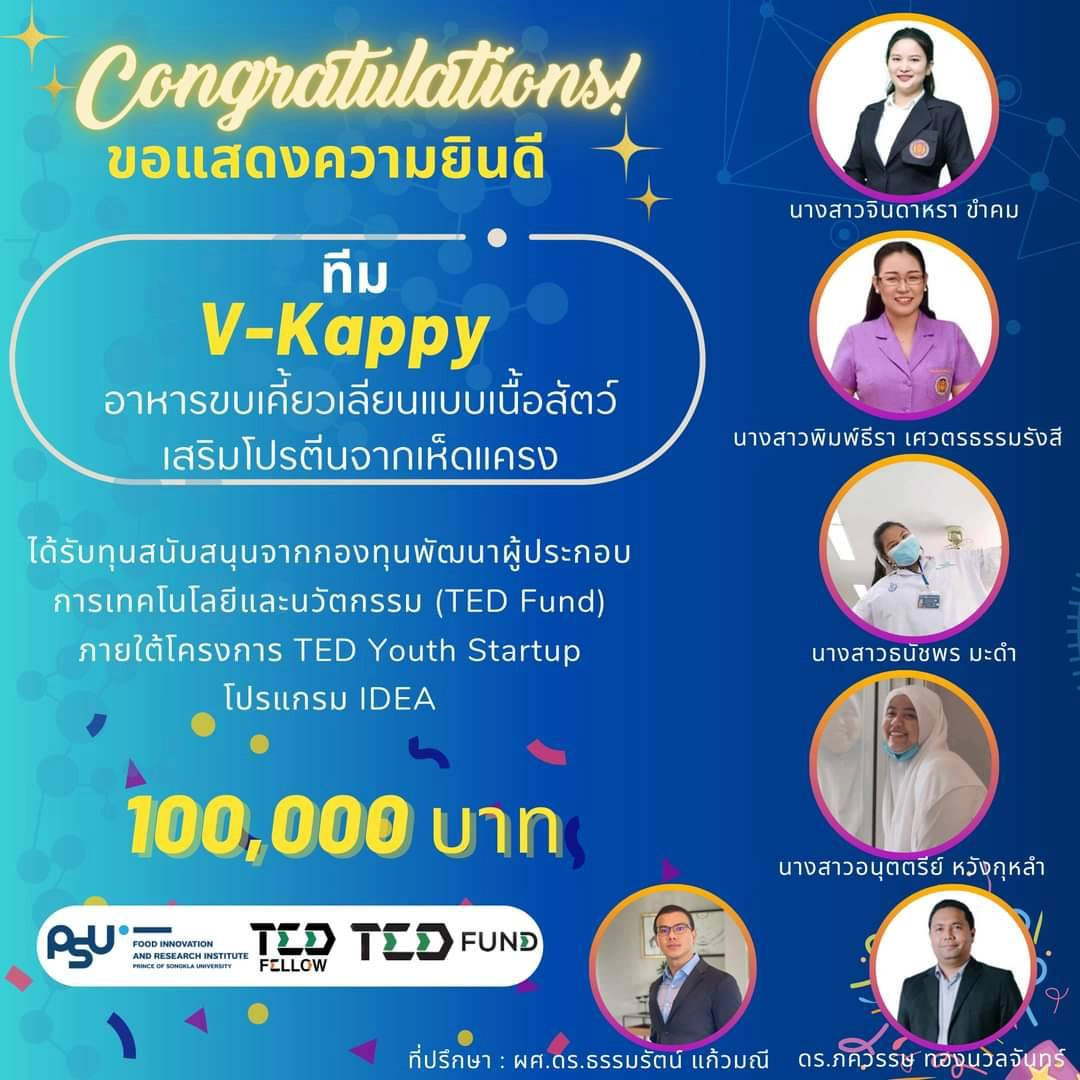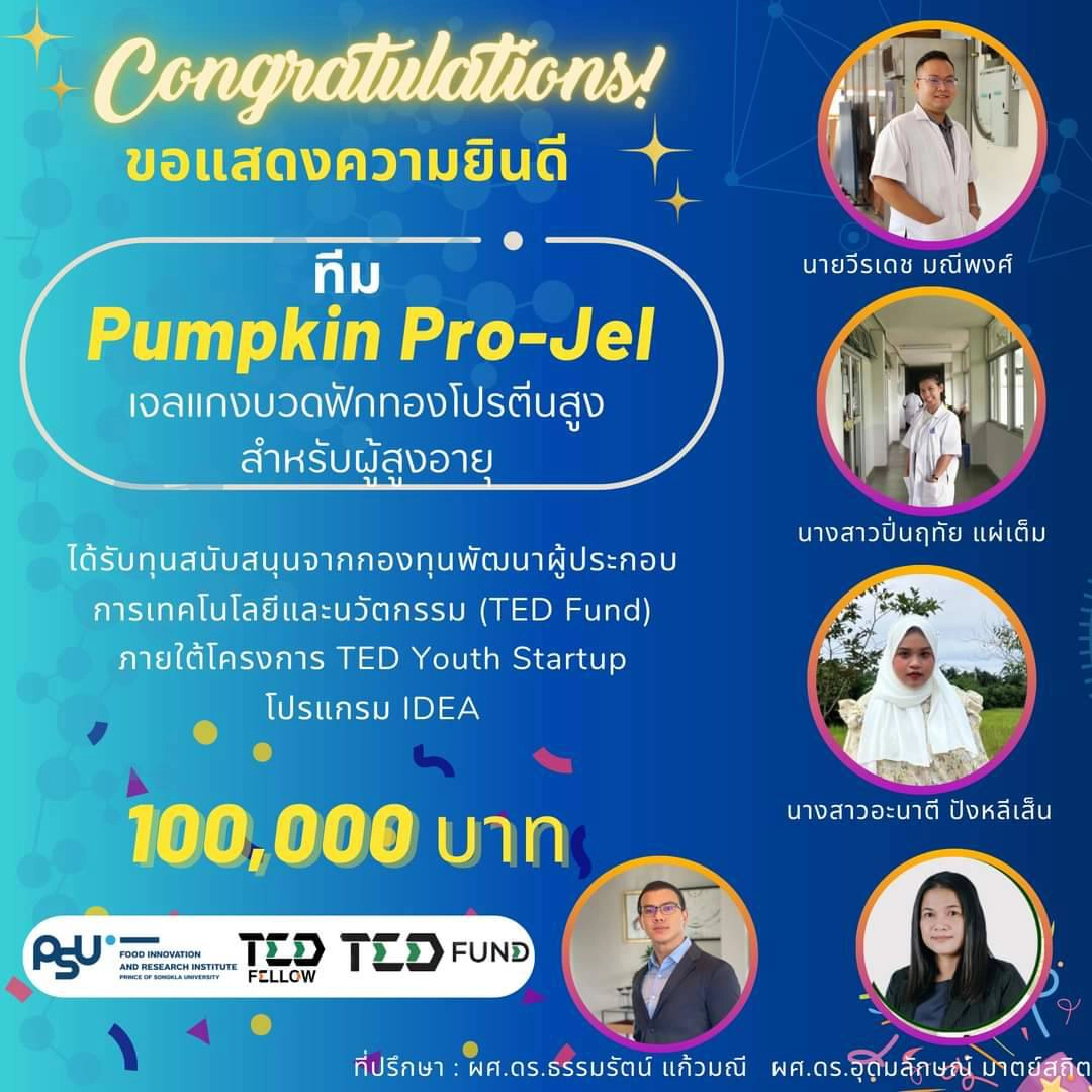 คณะวิทยาศาสตร์และเทคโนโลยี ขอแสดงความยินดีกับทีม V-Kappy และ Pumpkin Pro-Jel ที่ได้รับทุนสนับสนุน 100,000 บาท จากกองทุนพัฒนาผู้ประกอบการเทคโนโลยีและนวัตกรรม (TED Fund) ภายใต้ โครงการยุววิสาหกิจเริ่มต้น "TED Youth Startup" โปรแกรม IDEA รอบที่ 2 งบประมาณ 2566 โดยมี ผศ.ดร.ธรรมรัตน์ แก้วมณี ดร.ภควรรษ ทองนวลจันทร์ และ ผศ.ดร.อุดมลักษณ์ มาตย์สถิต คณาจารย์จากสาขาวิชาวิทยาศาสตร์การอาหารและโภชนาการ เป็นที่ปรึกษา