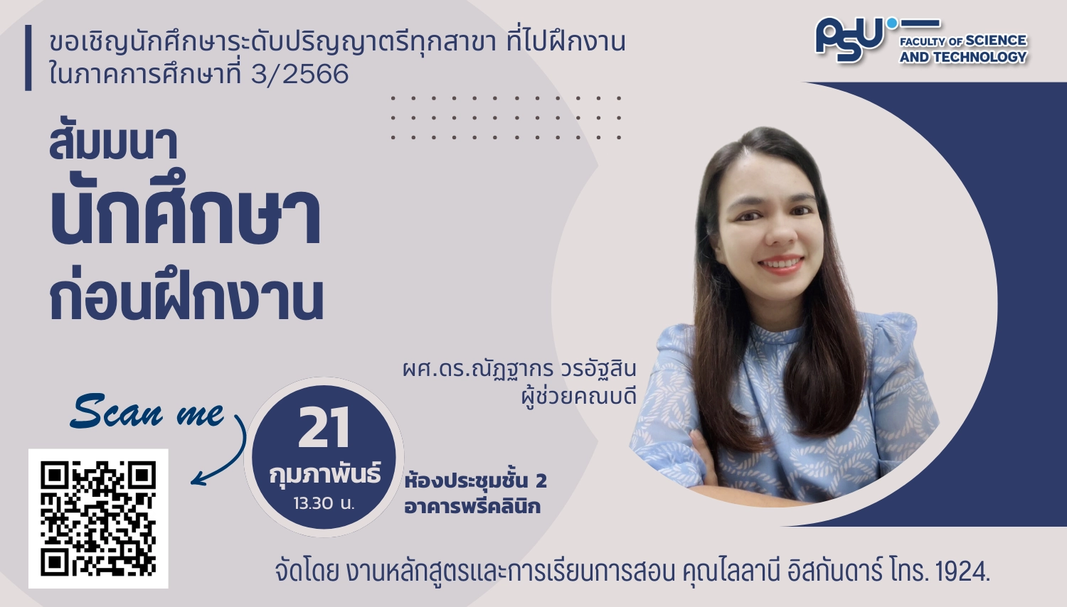 หน่วยหลักสูตรและการเรียนการสอน คณะ วทท. ขอเชิญนักศึกษาระดับปริญญาตรีทุกสาขา ที่ไปฝึกงาน ในภาคการศึกษาที่ 3/2566 เข้ารับการสัมมนานักศึกษาก่อนฝึกงาน ประจำปีการศึกษา 2566 วิทยากรโดย ผศ.ดร.ณัฏฐากร วรอัฐสิน ผู้ช่วยคณบดี ในวันที่ 21 กุมภาพันธ์ 2567 เวลา 13.00 น. ณ ห้องประชุม ชั้น 2 อาคารพรีคลินิก นักศึกษาสามารถลงทะเบียนได้ที่ https://forms.gle/SC58T5RyCNPJcMzz5 หรือสอบถามรายละเอียดเพิ่มเติมได้ที่ คุณไลลานี อิสกันดาร์ โทร. 1924