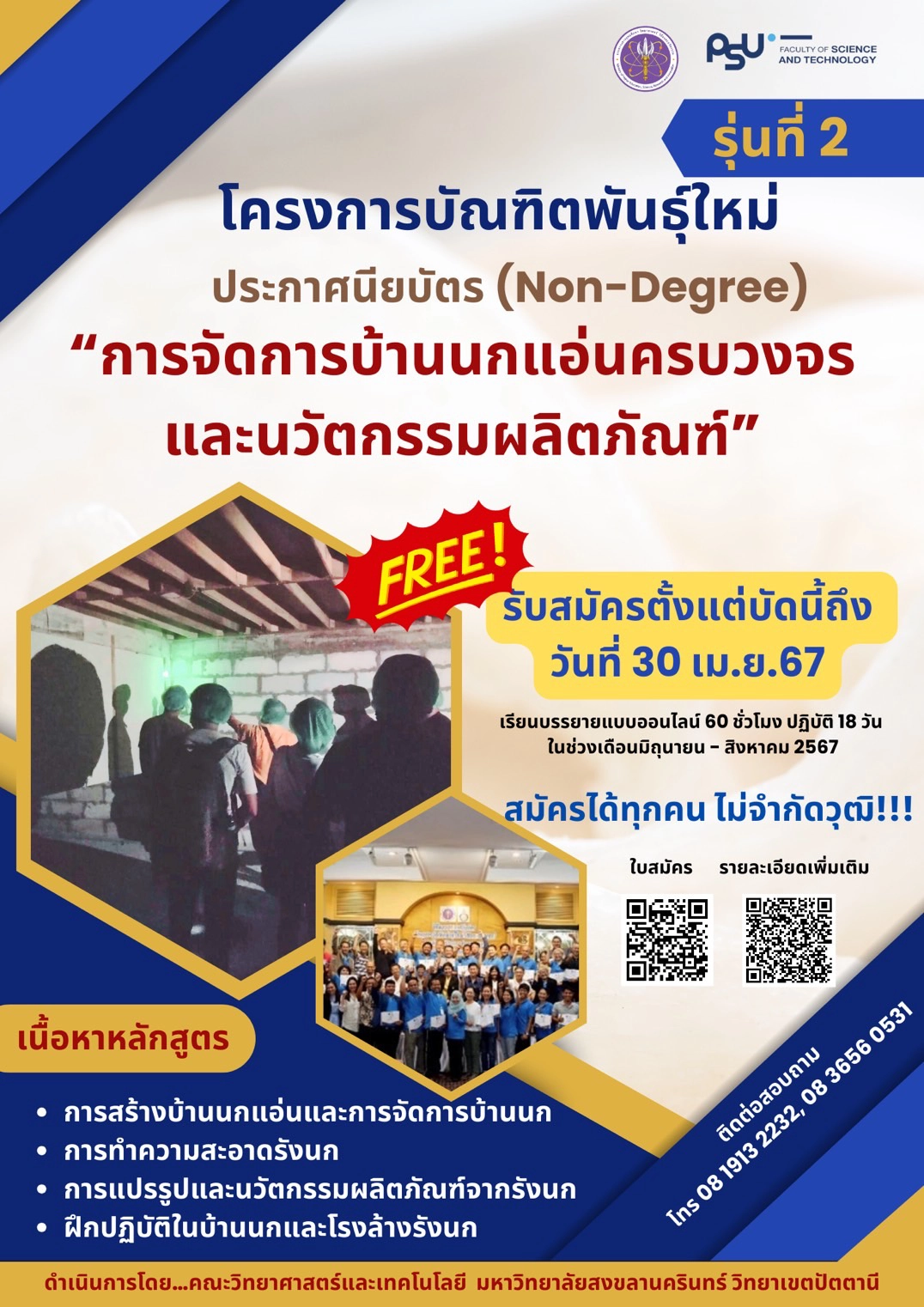 คณะวิทยาศาสตร์และเทคโนโลยี รับสมัครผู้สนใจไม่จำกัดวุฒิการศึกษา เข้าร่วมโครงการบัณฑิตพันธุ์ใหม่ (Non Degree) หลักสูตร “การจัดการบ้านนกแอ่นครบวงจรและนวัตกรรมผลิตภัณฑ์” โดยเรียนบรรยายแบบออนไลน์ จำนวน 60 ชั่วโมง และภาคปฏิบัติ จำนวน 18 วัน ช่วงเดือนมิถุนายน - สิงหาคม 2567 ในหัวข้อดังนี้