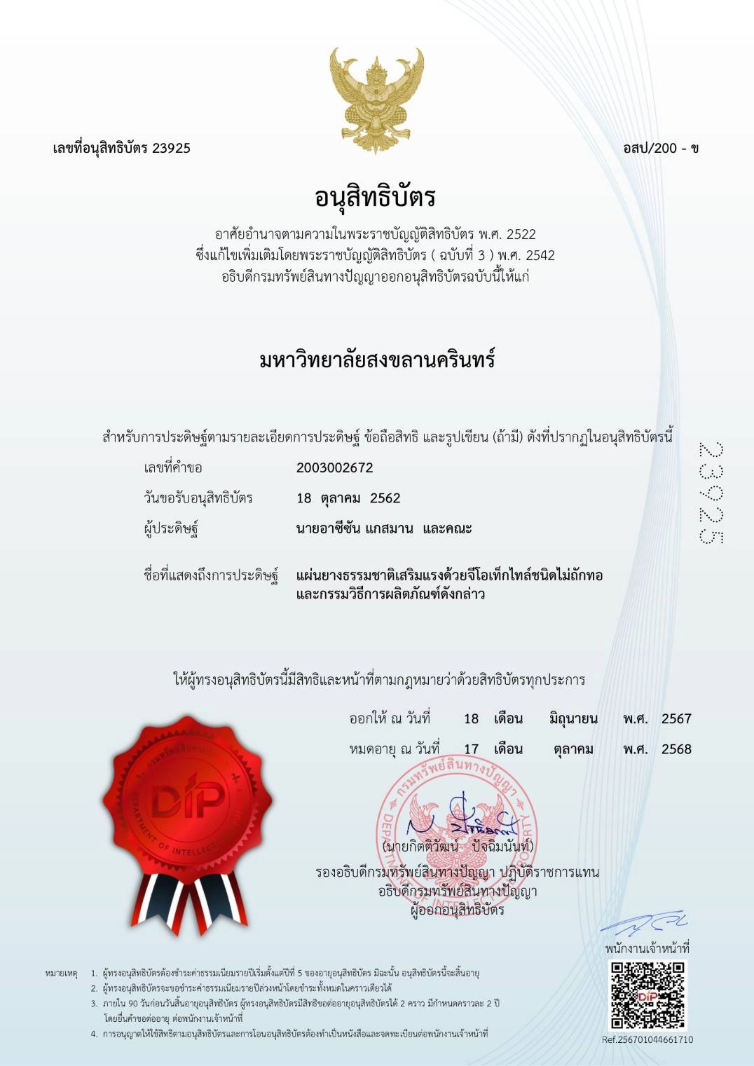 คณะวิทยาศาสตร์และเทคโนโลยี ขอแสดงความยินดีกับ รศ.อาซีซัน แกสมาน และคณะ (รศ.ดร.เจริญ นาคะสรรค์ และนายสมคิด ศรีสุวรรณ) ที่ผลงาน “แผ่นยางธรรมชาติเสริมแรงด้วยจีโอเท็กไทล์ชนิดไม่ถักทอและกรรมวิธีการผลิตภัณฑ์ดังกล่าว” ได้รับการจดอนุสิทธิบัตร จากกรมทรัพย์สินทางปัญญา ตั้งแต่วันที่ 18 มิถุนายน 2567" ทั้งนี้ ได้มีการขออนุญาตใช้สิทธิ์ทรัพย์สินทางปัญญาเพื่อขยายผลสู่การใช้ประโยชน์เพิ่มมูลค่ายางพาราของประเทศแล้ว