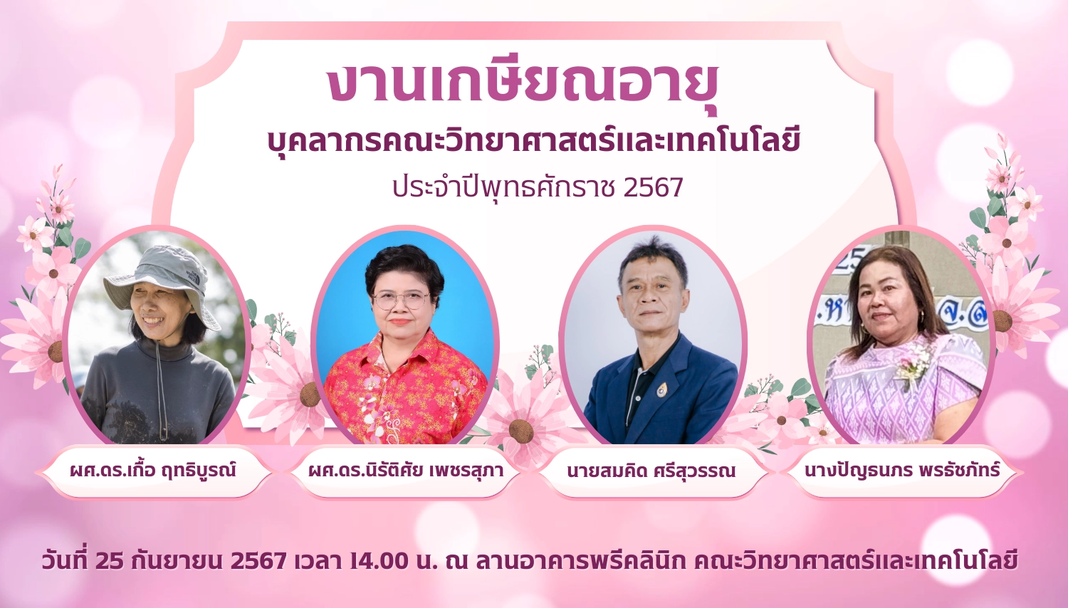 ขอเชิญบุคลากรคณะฯ ร่วมงานเกษียณอายุ ประจำปี 2567 ในวันที่ 25 กันยายน 2567 เวลา 14.00 น. ณ ลานอาคารพรีคลินิก ชั้น 1 โดยมีผู้เกษียณ จำนวน 4 ท่าน ดังนี้
