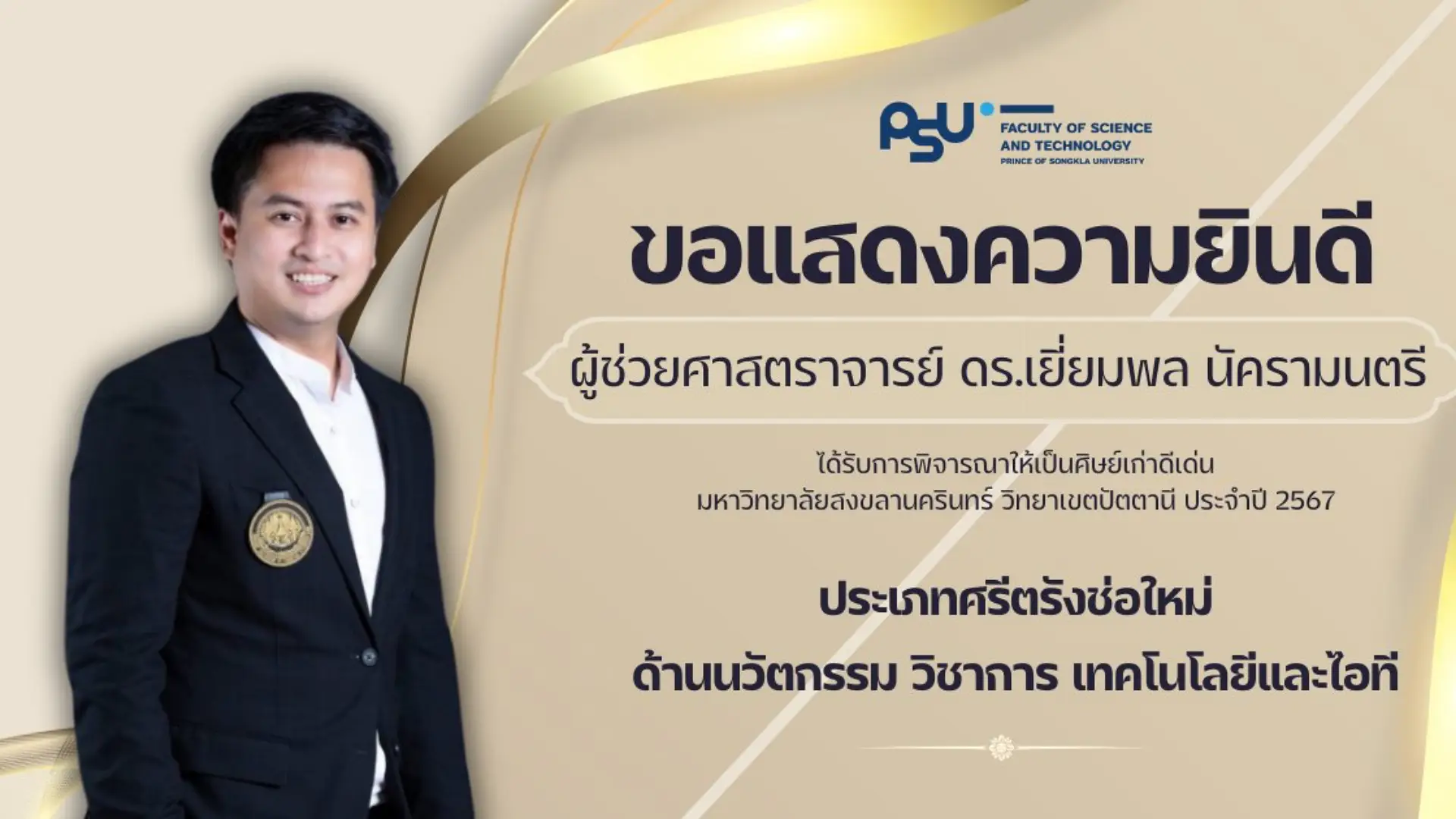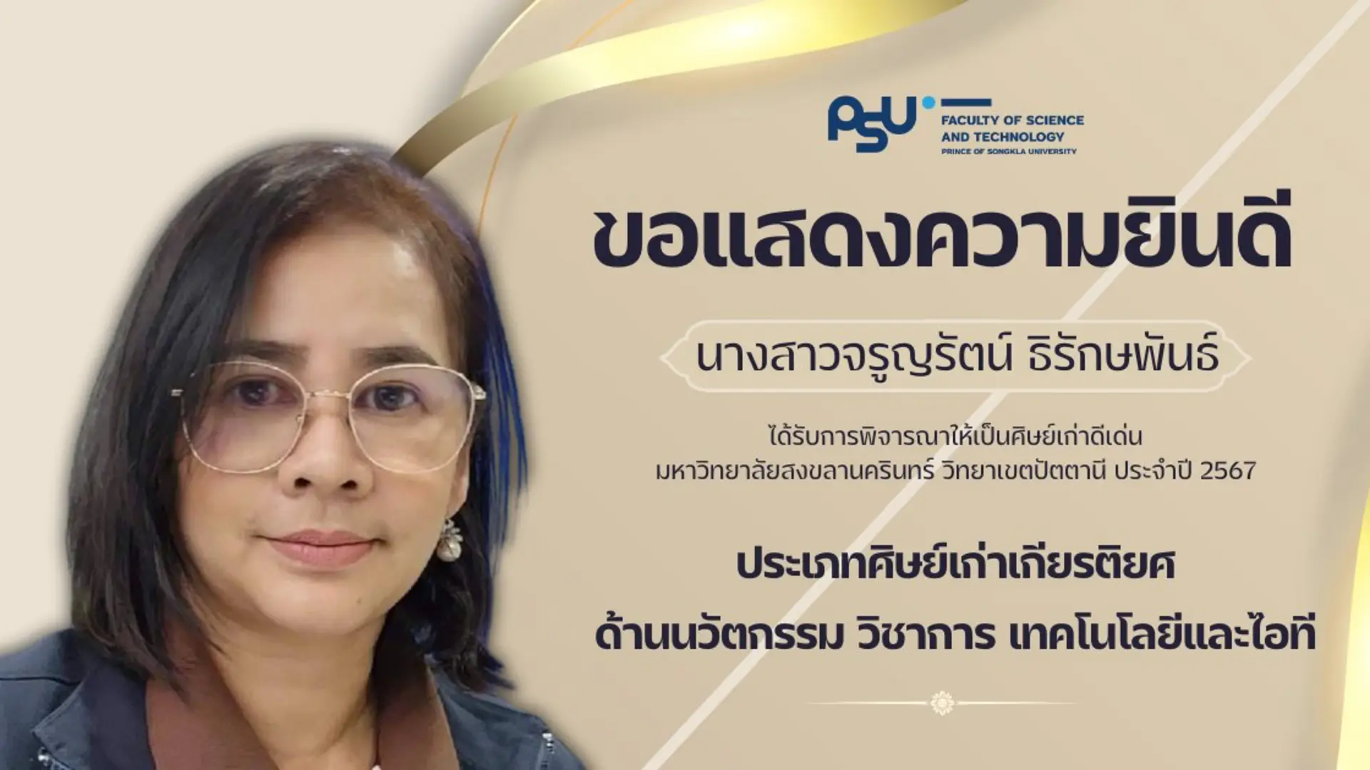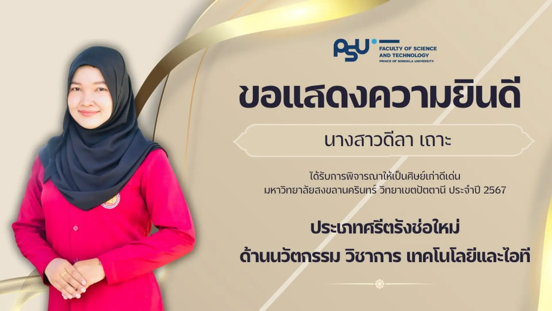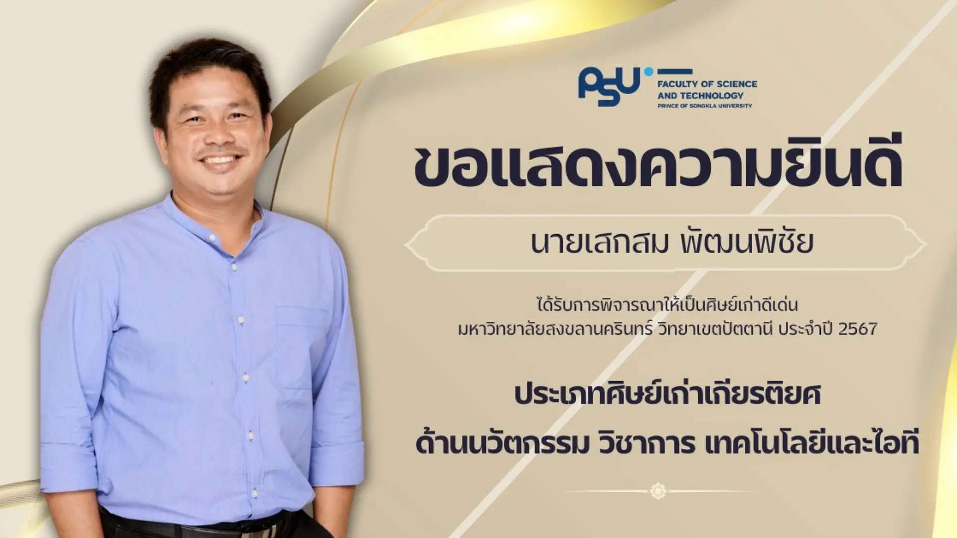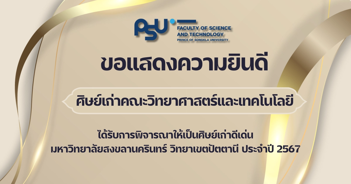 คณะวิทยาศาสตร์และเทคโนโลยี ขอแสดงความยินดีกับศิษย์เก่าคณะ ที่ได้รับการพิจารณารางวัลศิษย์เก่าดีเด่นมหาวิทยาลัยสงขลานครินทร์ วิทยาเขตปัตตานี ประจำปี 2567 ในด้านต่างๆ ดังนี้
