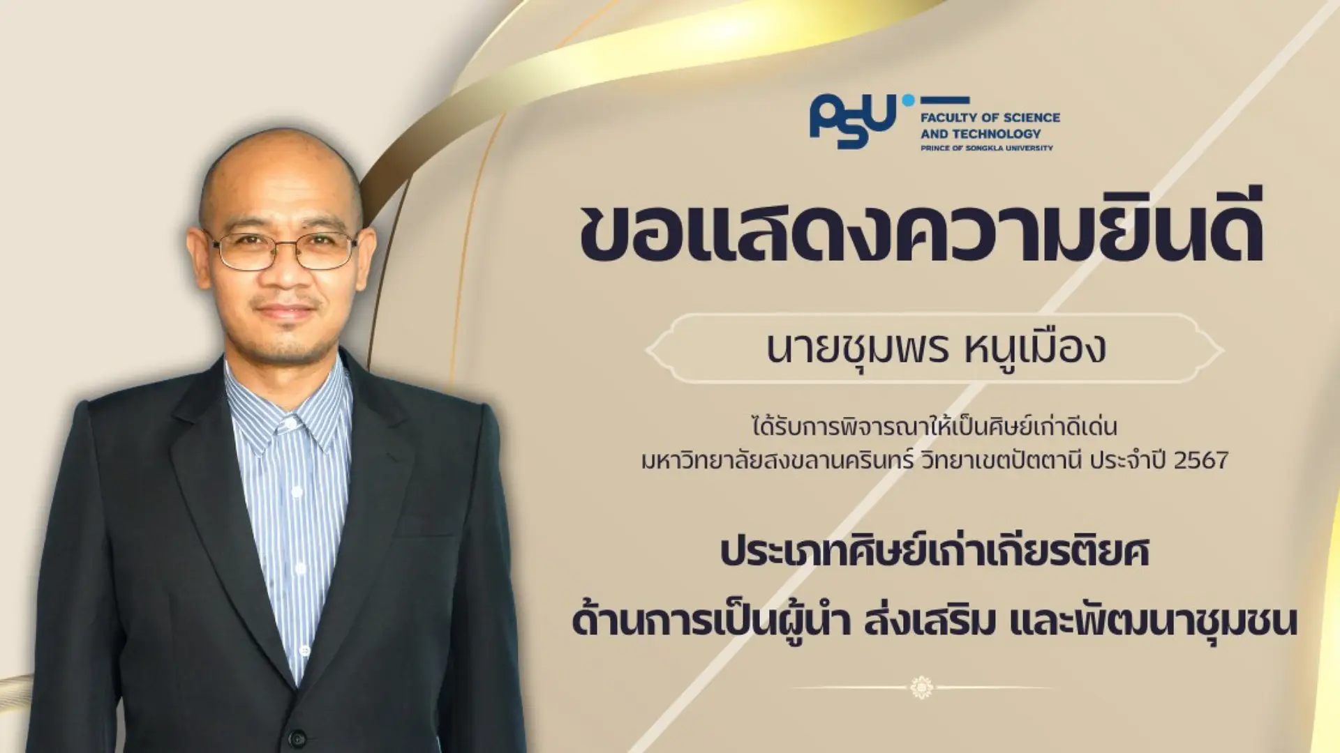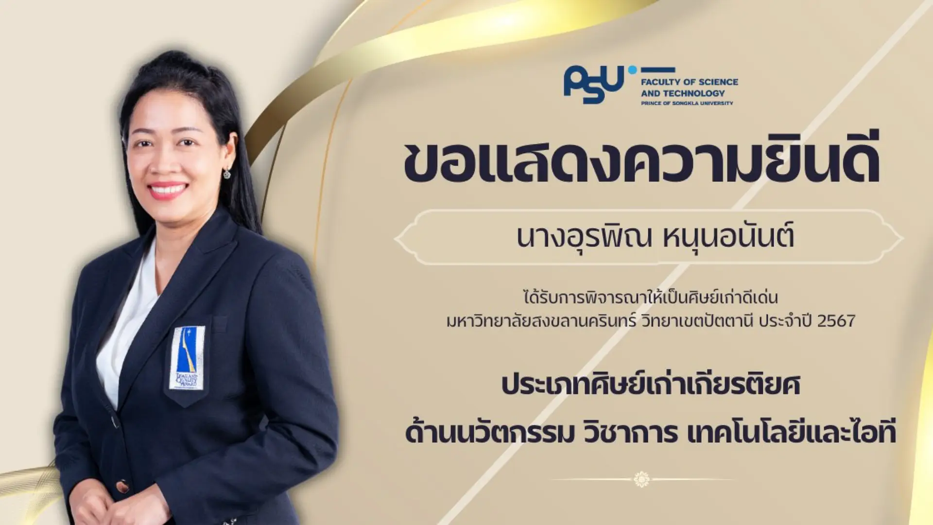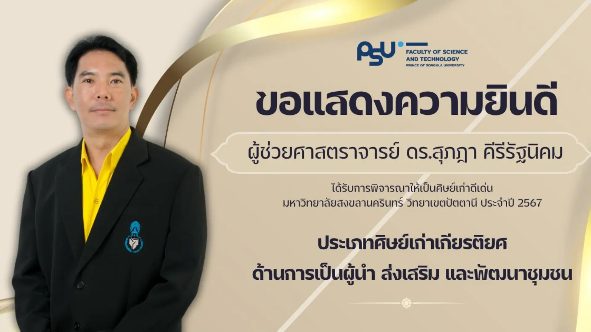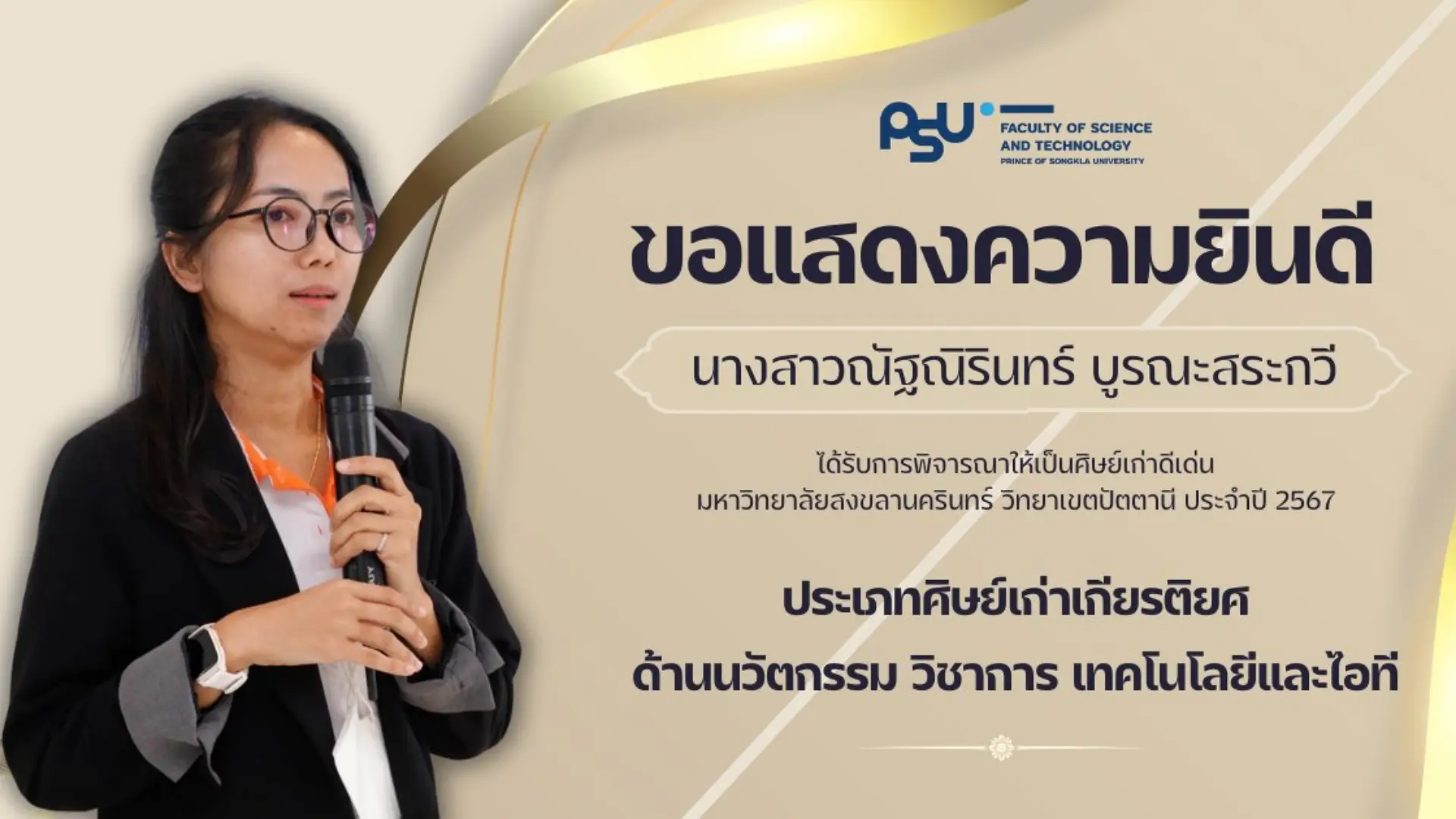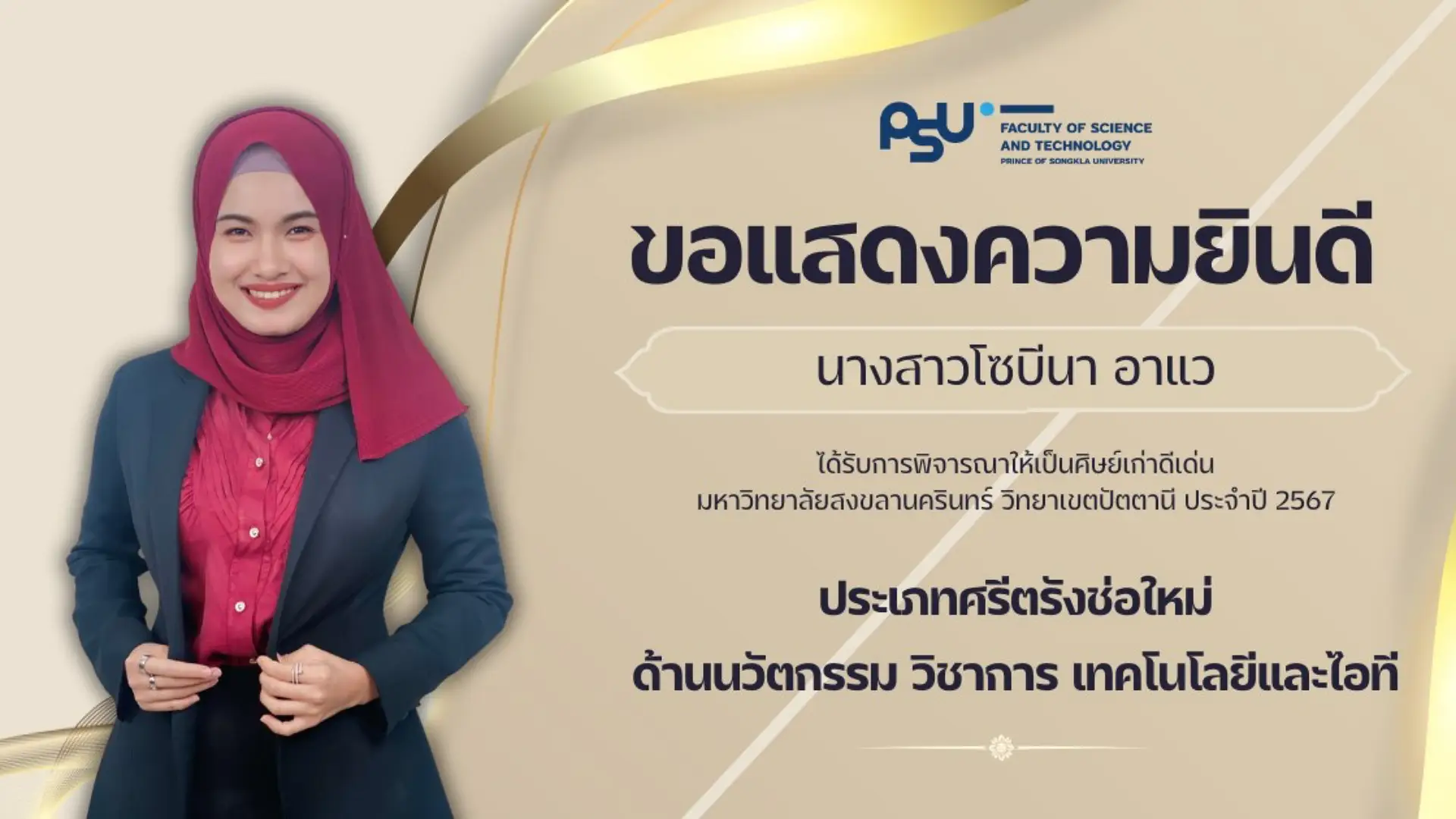 คณะวิทยาศาสตร์และเทคโนโลยี ขอแสดงความยินดีกับศิษย์เก่าคณะ ที่ได้รับการพิจารณารางวัลศิษย์เก่าดีเด่นมหาวิทยาลัยสงขลานครินทร์ วิทยาเขตปัตตานี ประจำปี 2567 ในด้านต่างๆ ดังนี้