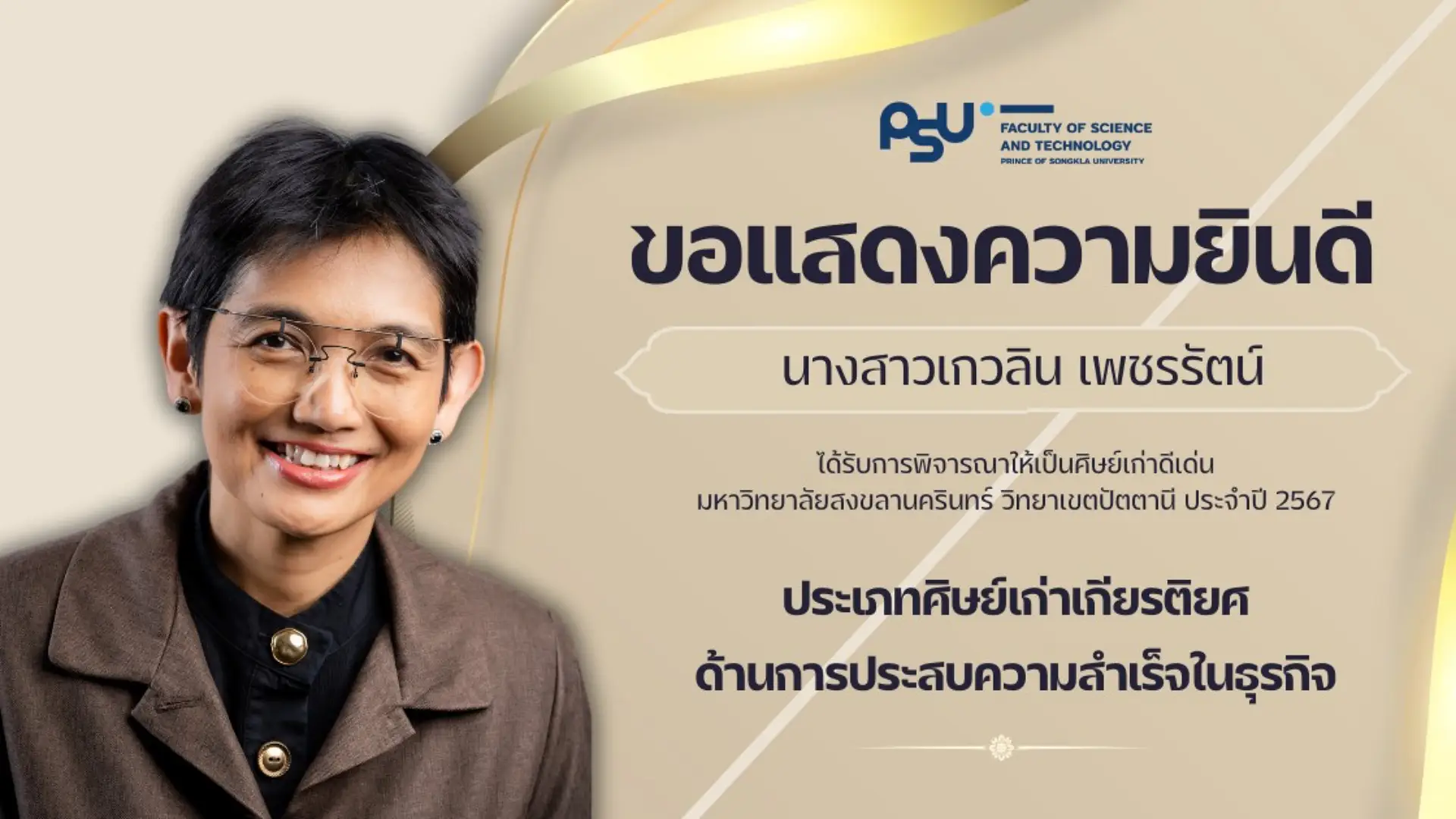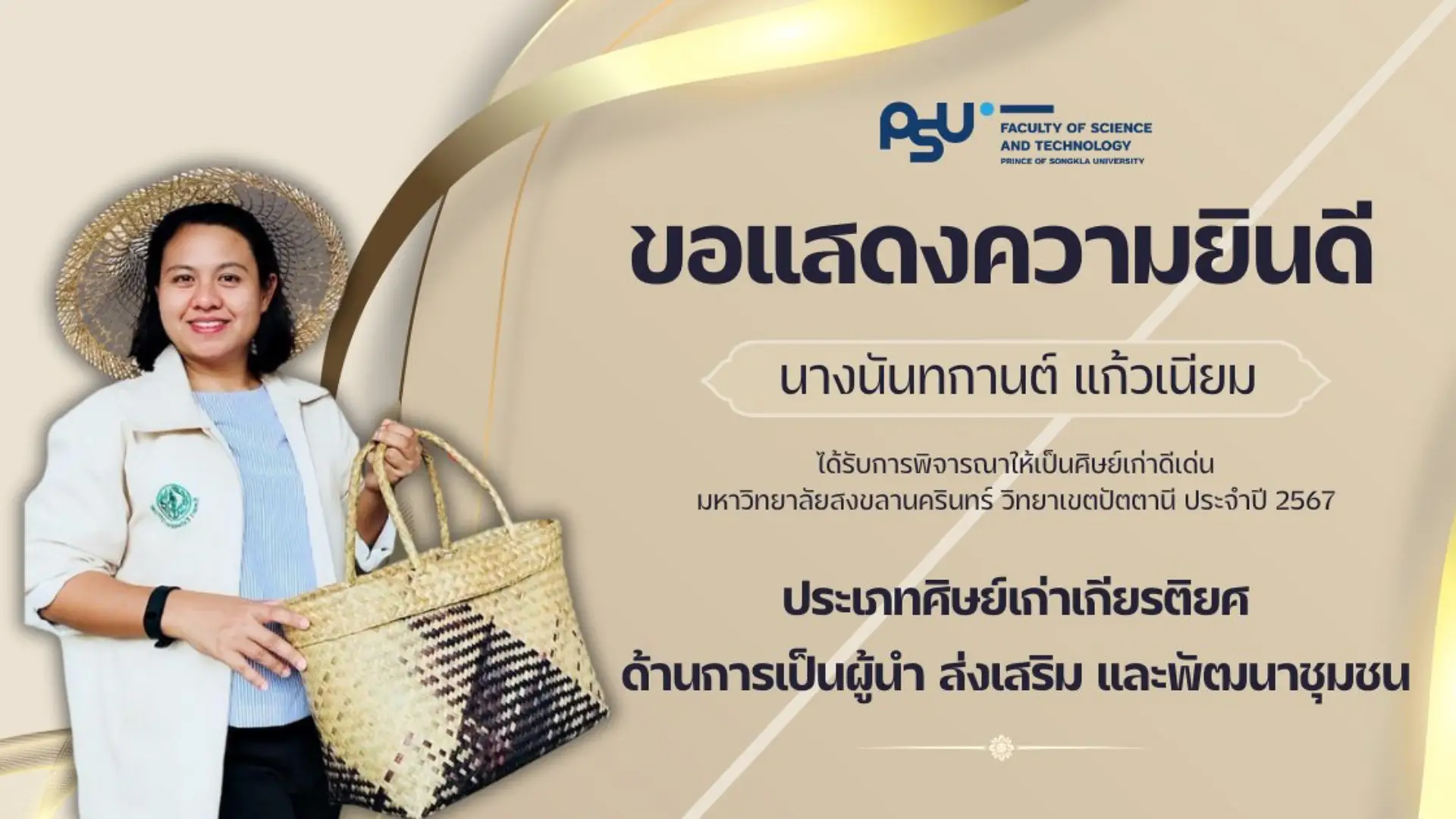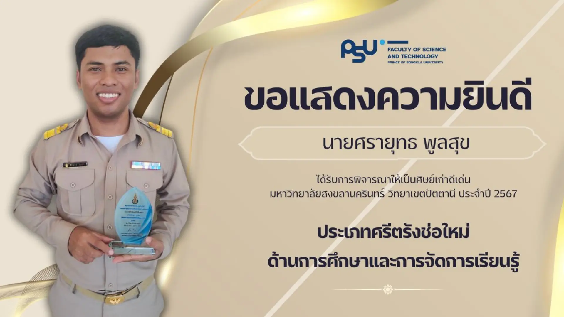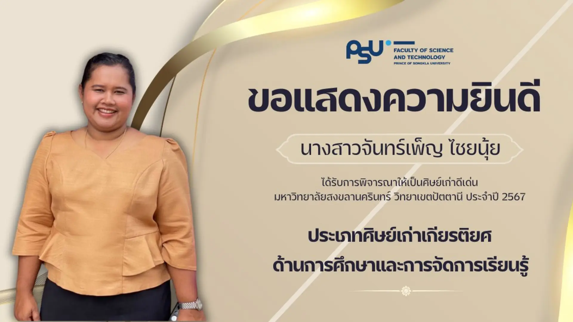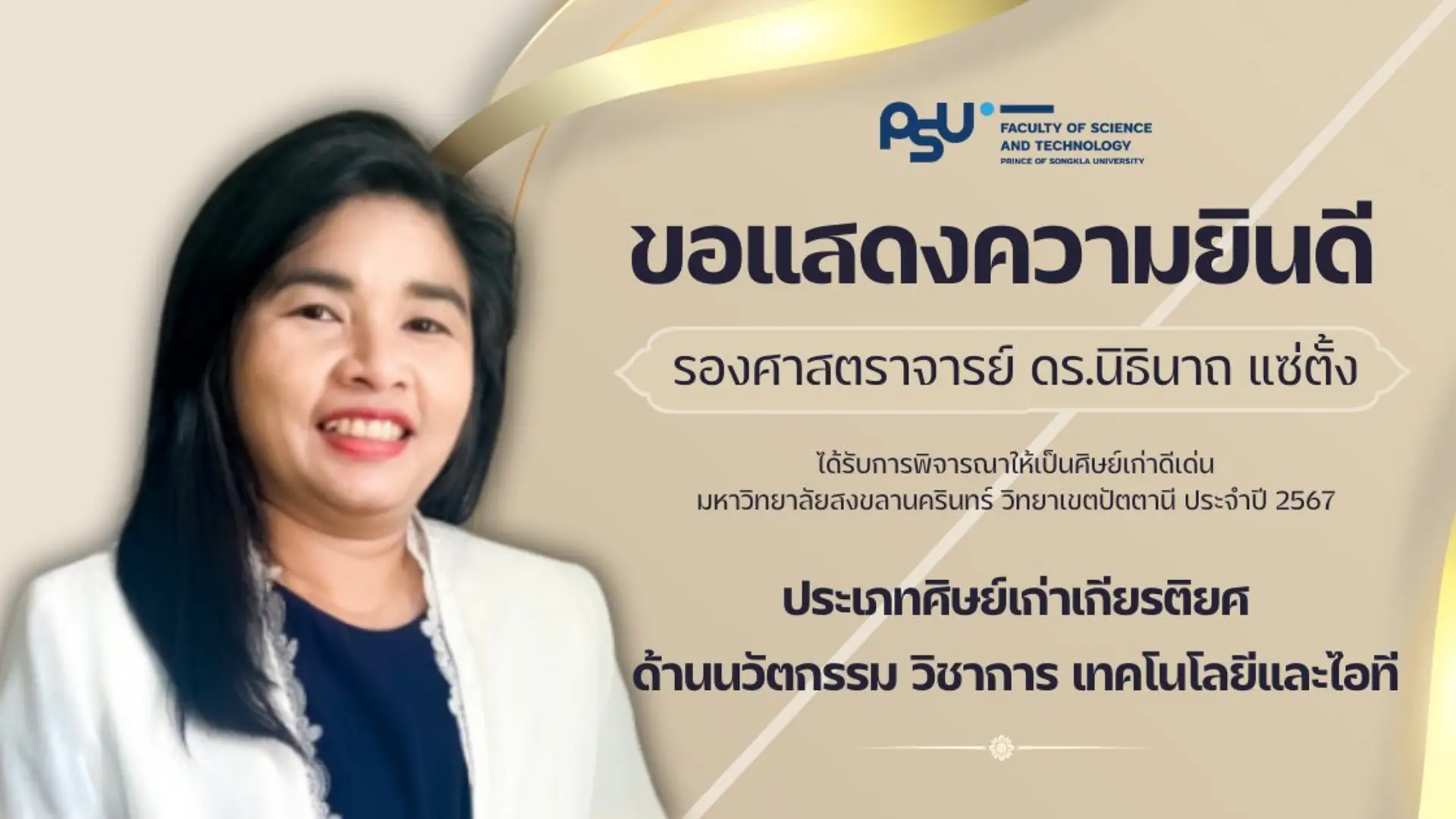 คณะวิทยาศาสตร์และเทคโนโลยี ขอแสดงความยินดีกับศิษย์เก่าคณะ ที่ได้รับการพิจารณารางวัลศิษย์เก่าดีเด่นมหาวิทยาลัยสงขลานครินทร์ วิทยาเขตปัตตานี ประจำปี 2567 ในด้านต่างๆ ดังนี้