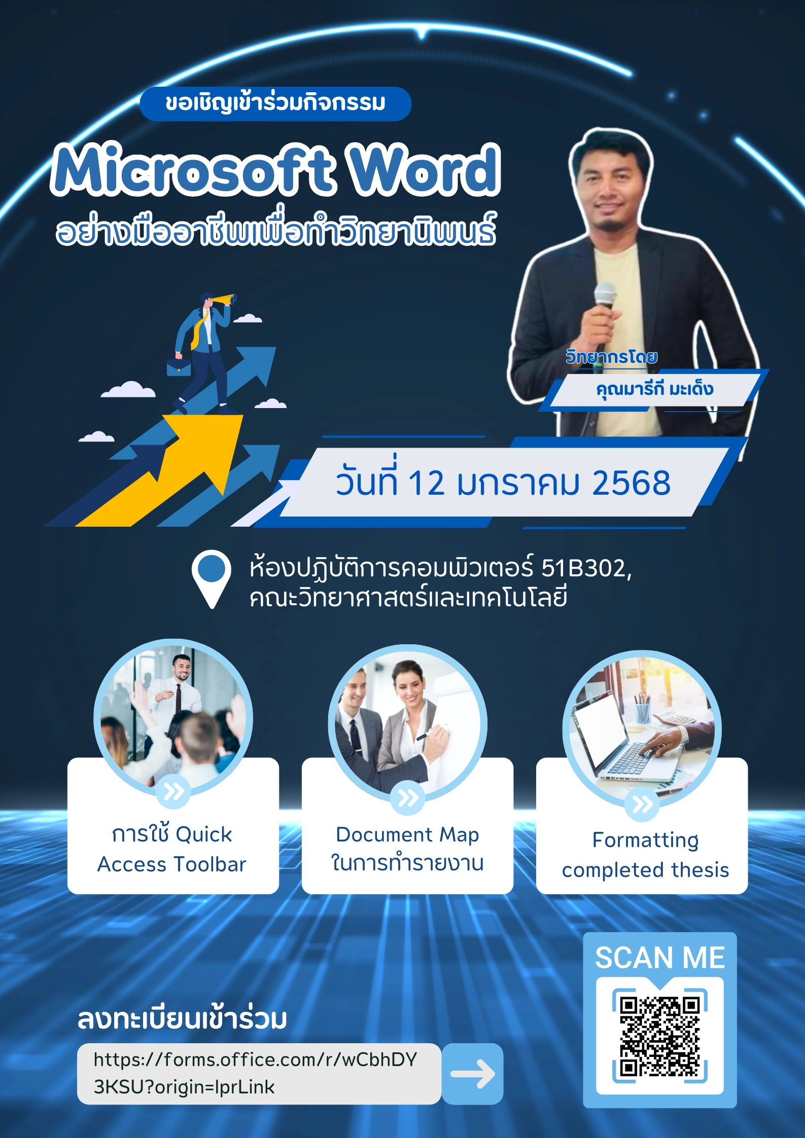 หน่วยบัณฑิตศึกษา คณะวิทยาศาสตร์และเทคโนโลยี ขอเชิญนักศึกษาระดับบัณฑิตศึกษา และผู้สนใจ เข้าร่วมโครงการอบรมเชิงปฏิบัติการ เรื่อง "Microsoft Word อย่างมืออาชีพเพื่อทำวิทยานิพนธ์" โดย อาจารย์มารีกี มะเด็ง เป็นวิทยากร ในวันอาทิตย์ที่ 12 มกราคม 2568 ณ ห้องปฎิบัติการคอมพิวเตอร์ 51B302 คณะวิทยาศาสตร์และเทคโนโลยี ทั้งนี้เพื่อให้ผู้เข้ารับการอบรมสามารจัดรูปแบบเล่มวิทยานิพนธ์ได้อย่างรวดเร็ว ถูกต้อง และสวยงาม โดยผู้สนใจเข้าร่วมสามารถลงทะเบียนออนไลน์ได้ที่ https://forms.office.com/r/wCbhDY3KSU?origin=lprLink หรือสอบถามรายละเอียดได้ที่ คุณอัชรีดา วันสุไลมาน หน่วยบัณฑิตศึกษา โทร. 1809