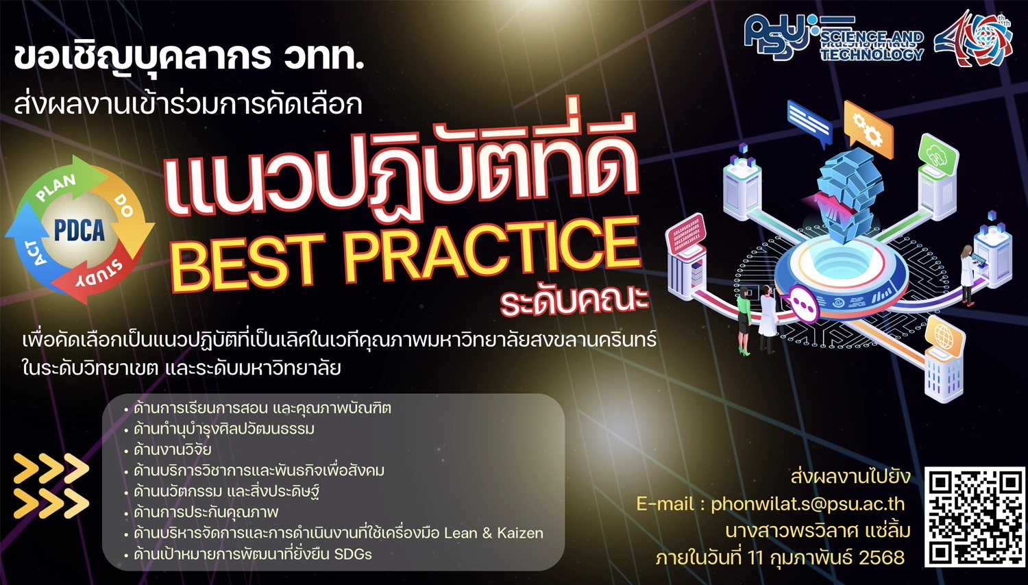 คณะวิทยาศาสตร์และเทคโนโลยี ขอเชิญบุคลากรส่งผลงานเข้าร่วมประกวด แนวปฏิบัติที่ดี (Best Practice) ระดับคณะ เพื่อคัดเลือกเป็นแนวปฏิบัติที่เป็นเลิศในเวทีคุณภาพมหาวิทยาลัยสงขลานครินทร์ในระดับวิทยาเขต และระดับมหาวิทยาลัย โดยผู้สนใจสามารถกรอกแบบฟอร์ม https://shorturl.asia/p7WFG แล้วส่งไปยัง E-mail : phonwilat.s@psu.ac.th นางสาวพรวิลาศ แซ่ลิ้ม ผู้ประสานงาน ภายในวันที่ 11 กุมภาพันธ์ 2568