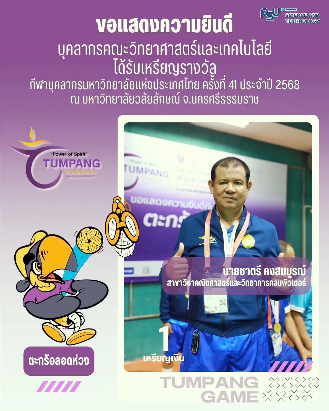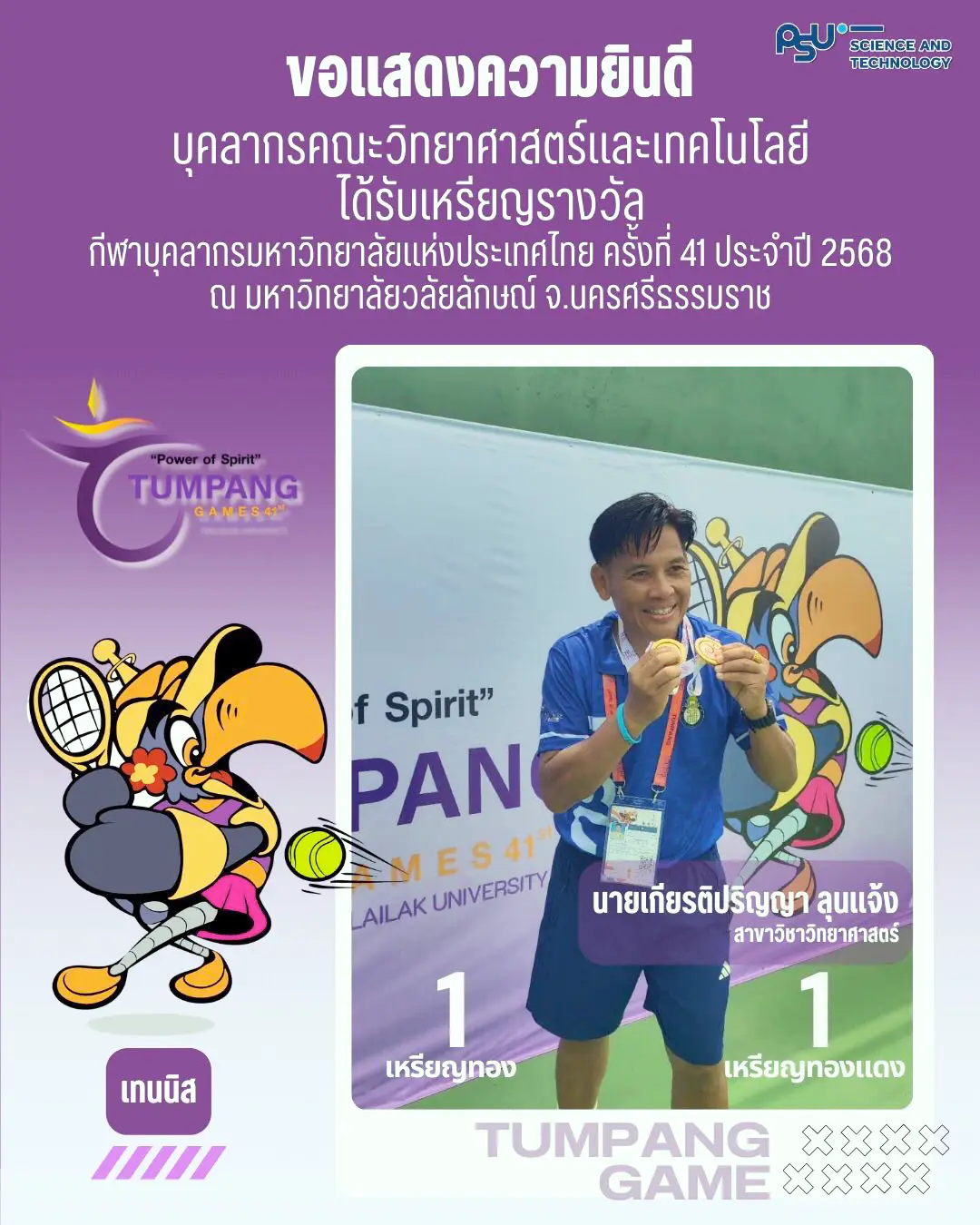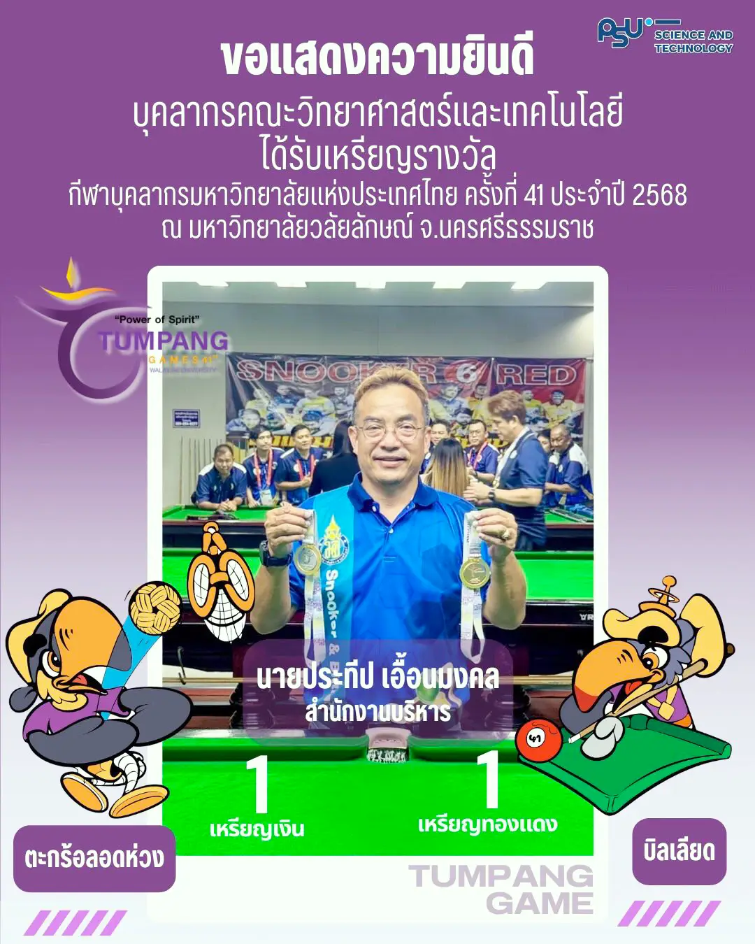 คณะวิทยาศาสตร์และเทคโนโลยี ขอแสดงความยินดีกับบุคลากรของคณะที่ได้รับเหรียญรางวัลในการแข่งขันกีฬาบุคลากรมหาวิทยาลัยแห่งประเทศไทย ครั้งที่ 41 ประจำปี 2568 ระหว่างวันที่ 2-11 พฤษภาคม 2568 ณ มหาวิทยาลัยวลัยลักษณ์ จ.นครศรีธรรมราช ดังนี้