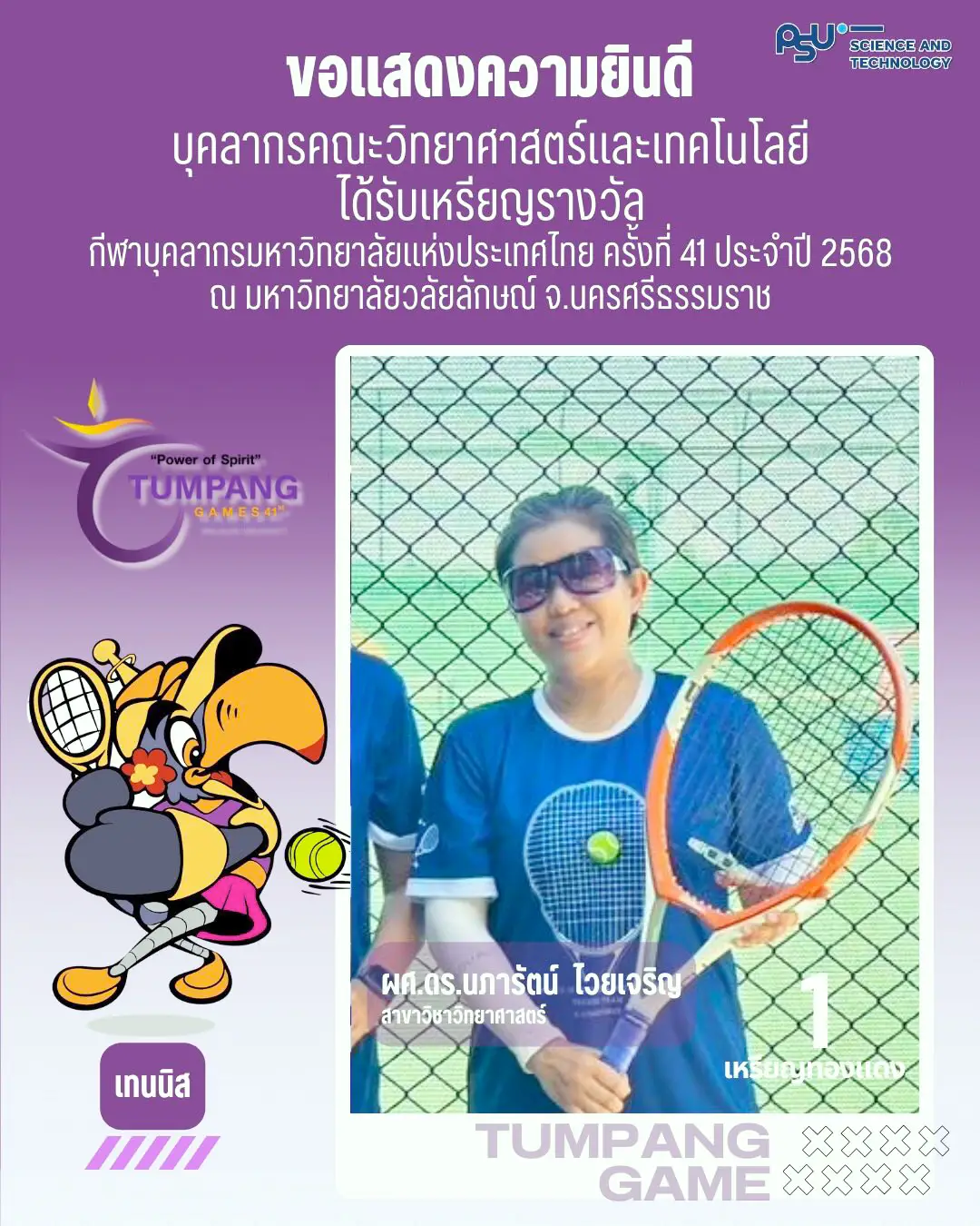 - ผศ.ดร.นภารัตน์ ไวยเจริญ 1 เหรียญทองแดง กีฬาเทนนิส