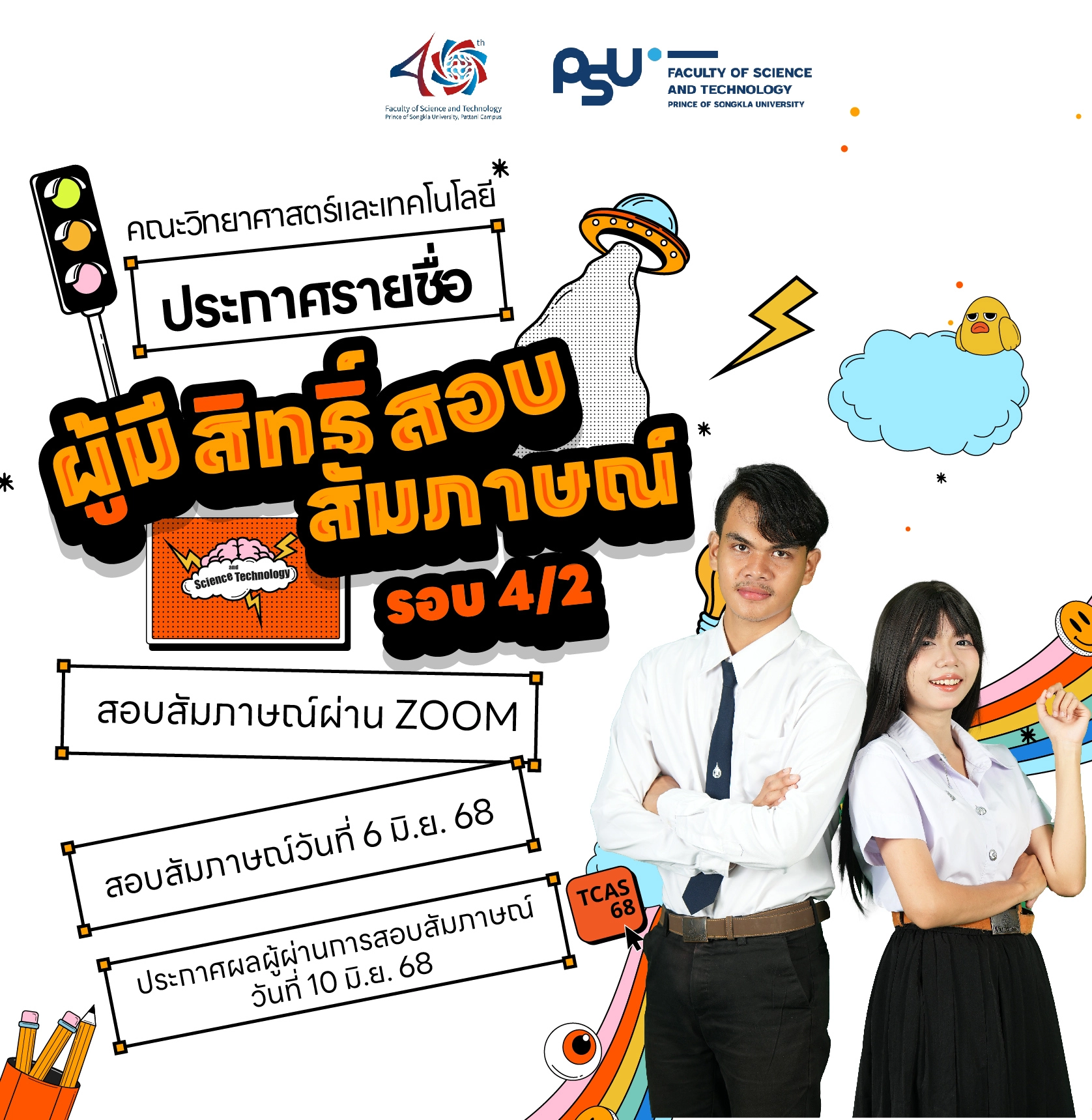 คณะวิทยาศาสตร์และเทคโนโลยีประกาศรายชื่อผู้มีสิทธิ์สอบสัมภาษณ์โครงการคณะวิทยาศาสตร์และเทคโนโลยี เพื่อเข้าศึกษาในคณะวิทยาศาสตร์และเทคโนโลยี ประจำปีการศึกษา 2568 (รอบที่ 4/2) จำนวน 5 โครงการ ดังนี้
