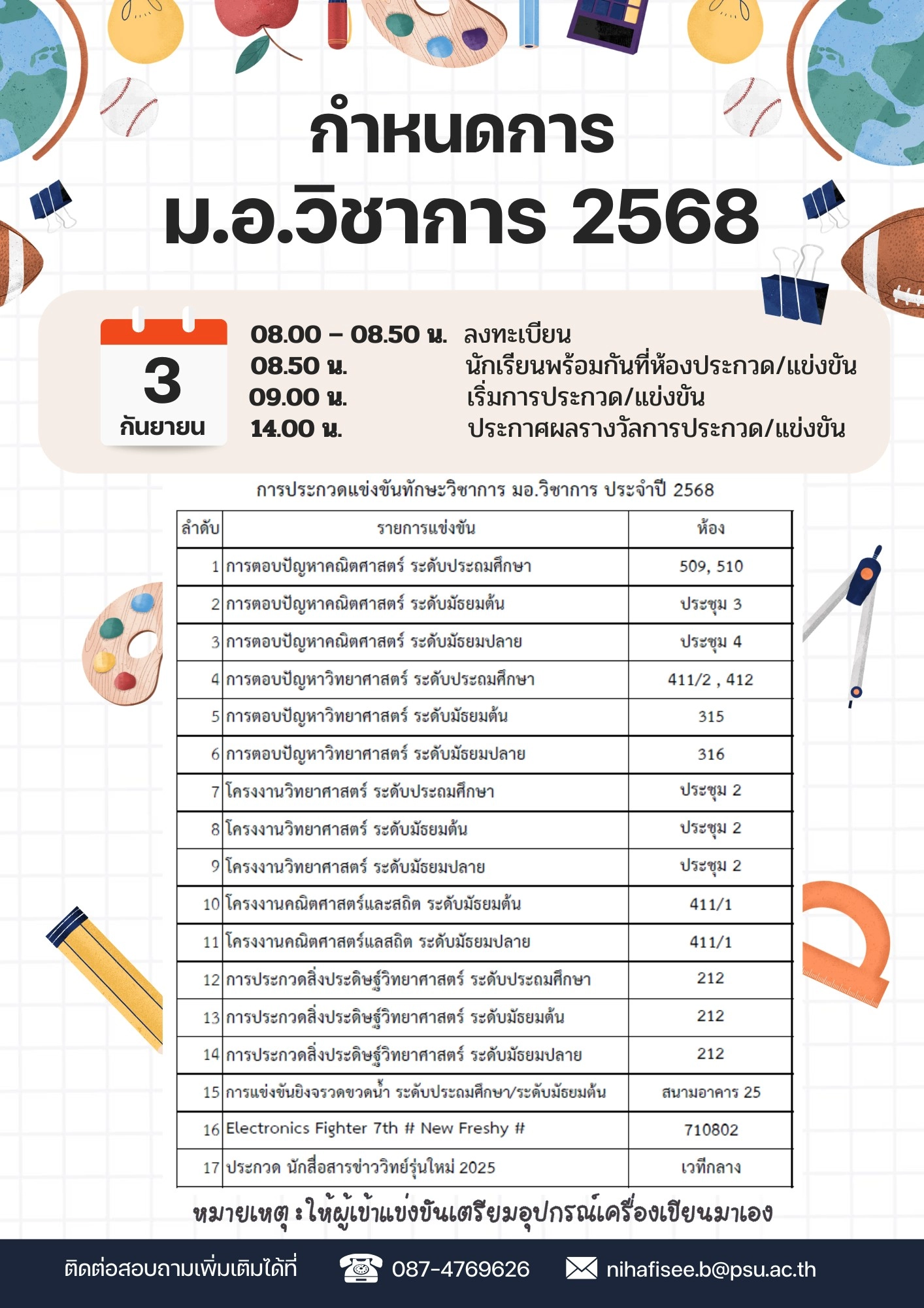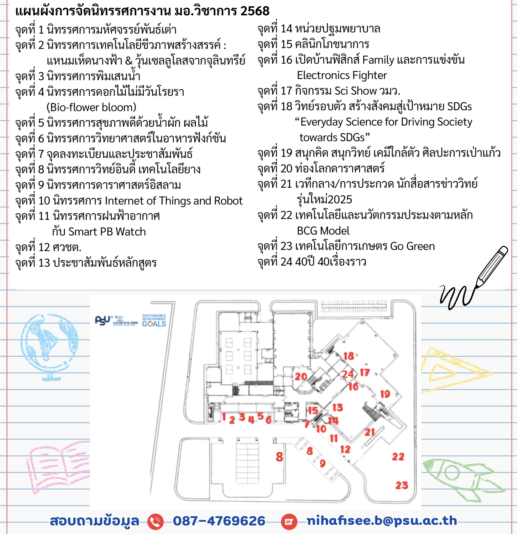 คณะวิทยาศาสตร์และเทคโนโลยี มหาวิทยาลัยสงขลานครินทร์ วิทยาเขตปัตตานี ขอเชิญชวนนักเรียน นักศึกษา ครูอาจารย์ และประชาชนทั่วไป ร่วมงาน "ม.อ. วิชาการ ประจำปี 2568" ภายใต้หัวข้อ "40 Anniversary: SAT for Sustainable Future – ขับเคลื่อนสังคม...สู่เป้าหมายการพัฒนาที่ยั่งยืน" ในวันที่ 3 กันยายน 2568 ตั้งแต่เวลา 08.30 น. เป็นต้นไป ณ อาคารพรีคลินิก มหาวิทยาลัยสงขลานครินทร์ วิทยาเขตปัตตานี