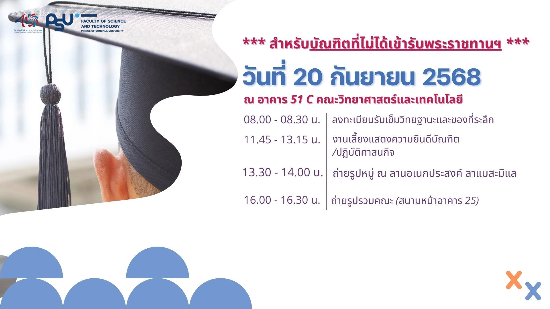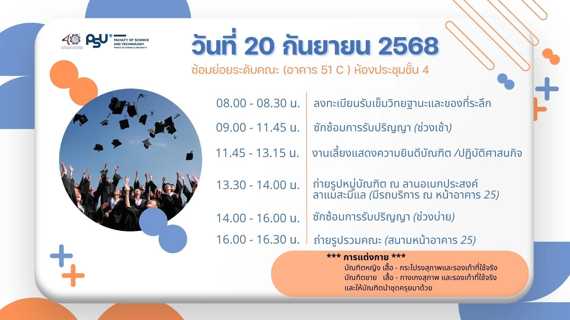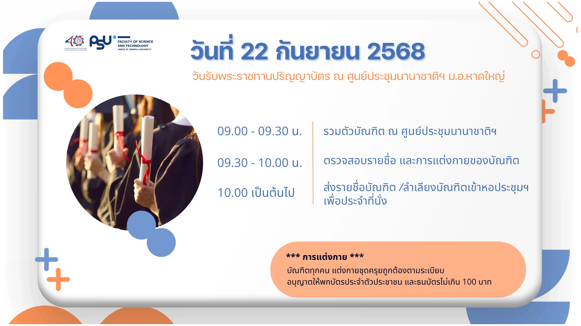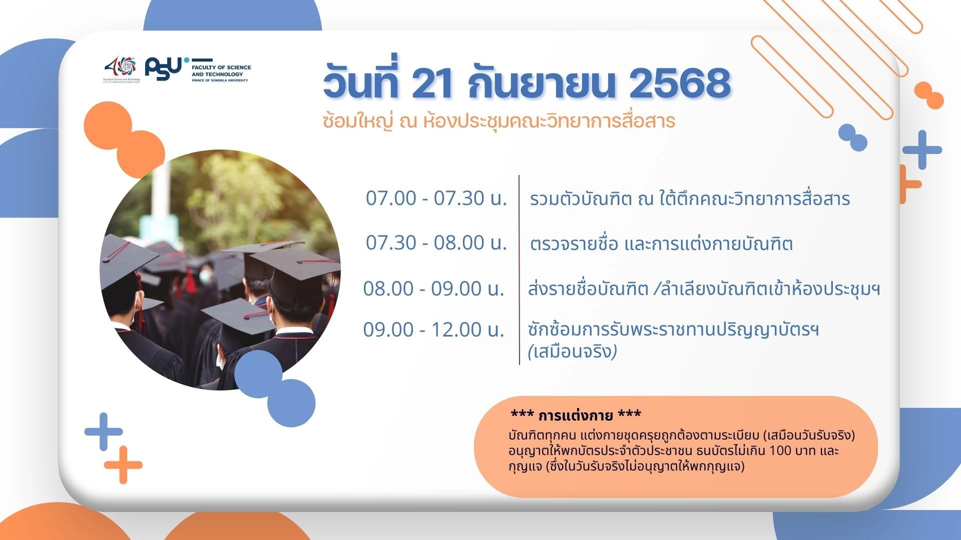 คณะวิทยาศาสตร์และเทคโนโลยี แจ้งปฏิทินพิธีพระราชทานปริญญาบัตรผู้สำเร็จการศึกษา ประจำปีการศึกษา 2567 เพื่อให้บัณฑิตได้ทราบข้อมูล โดยมีรายละเอียดดังนี้