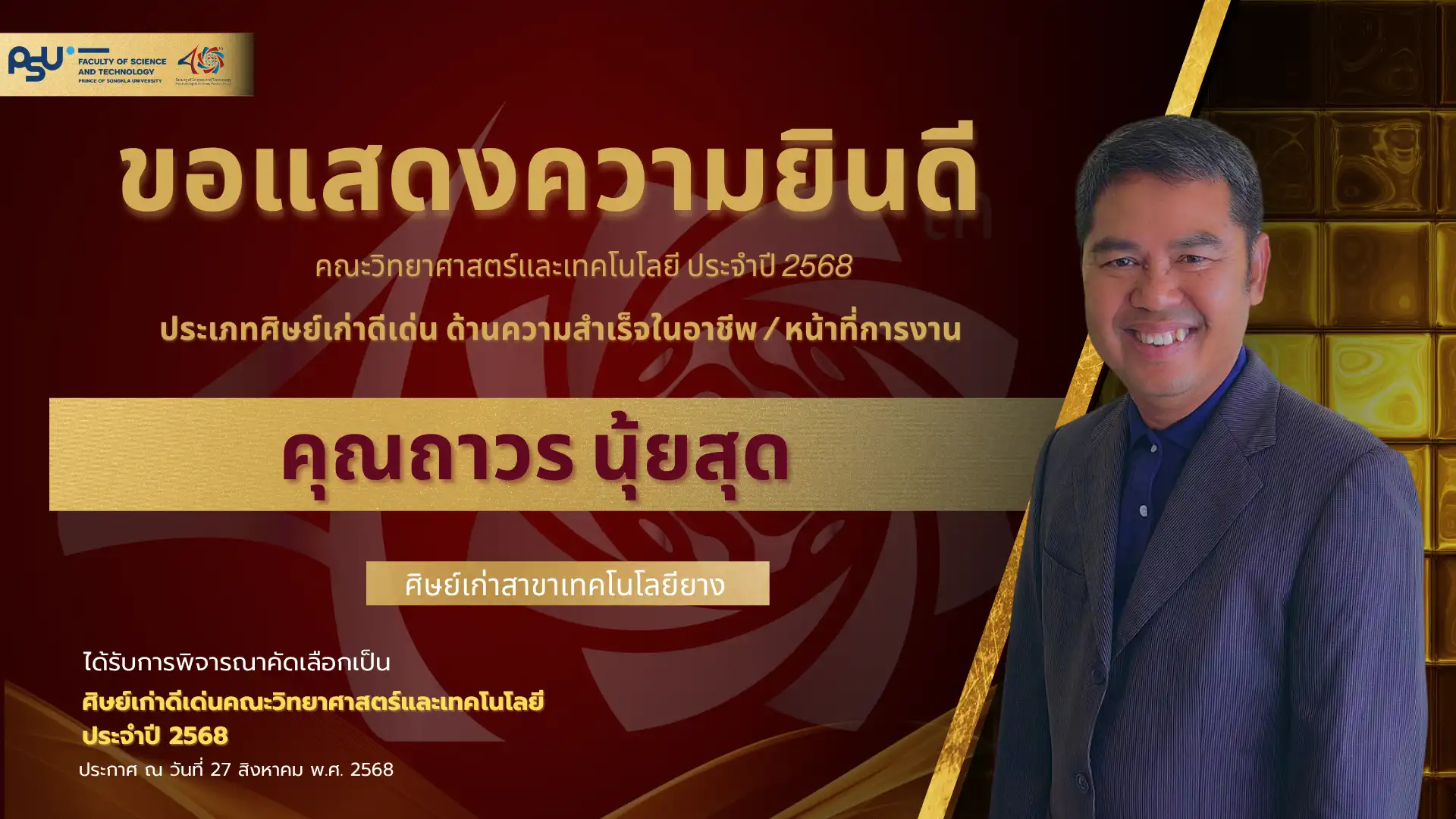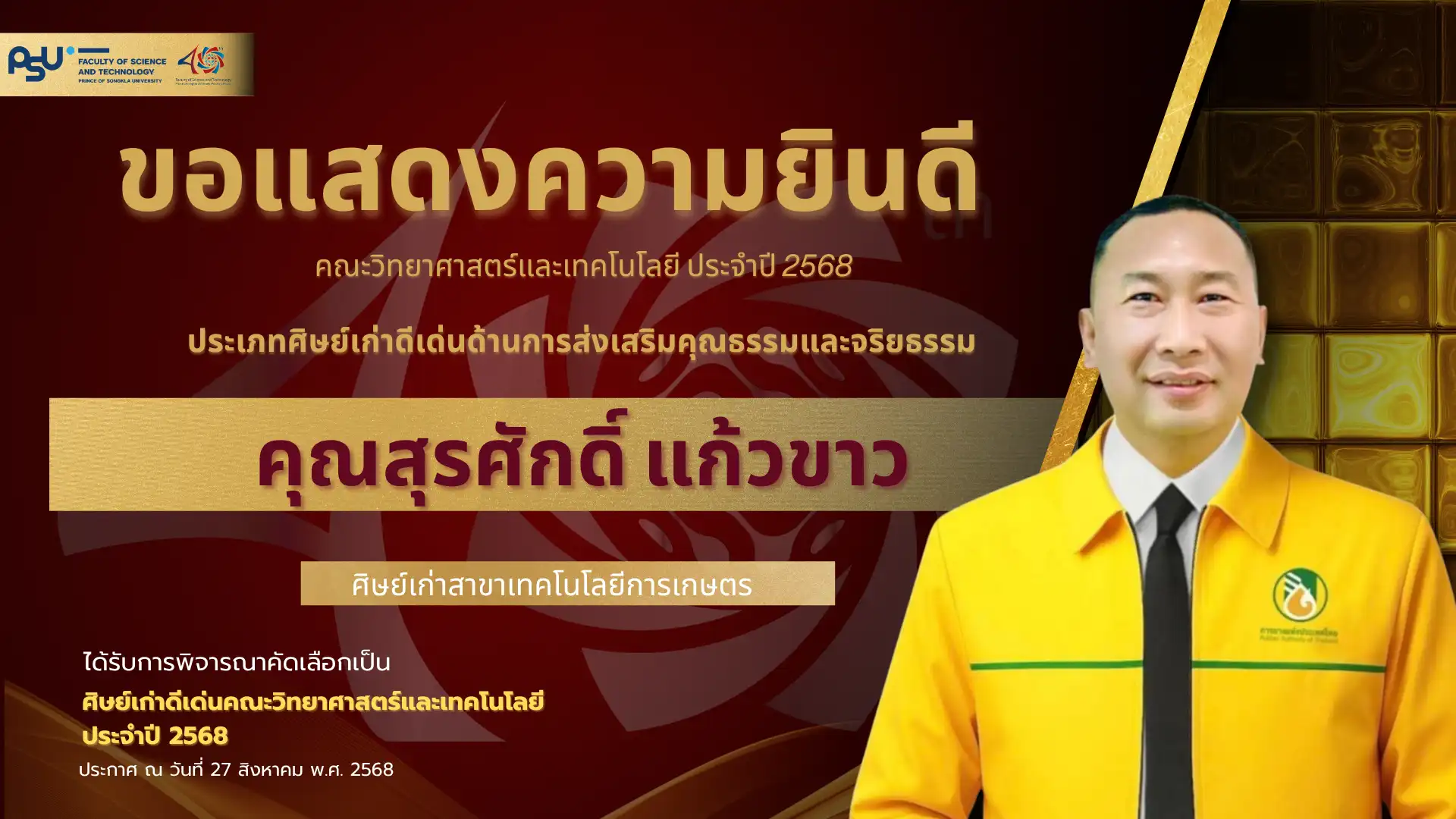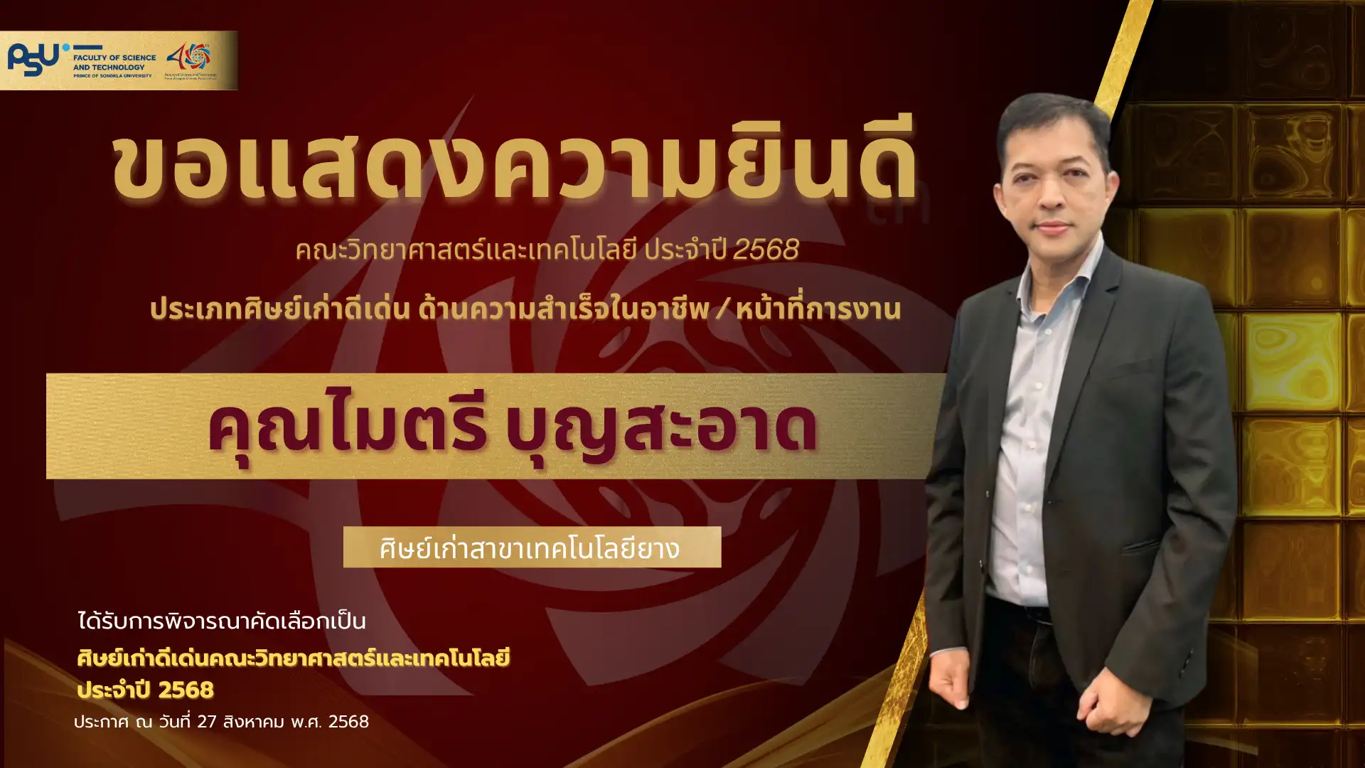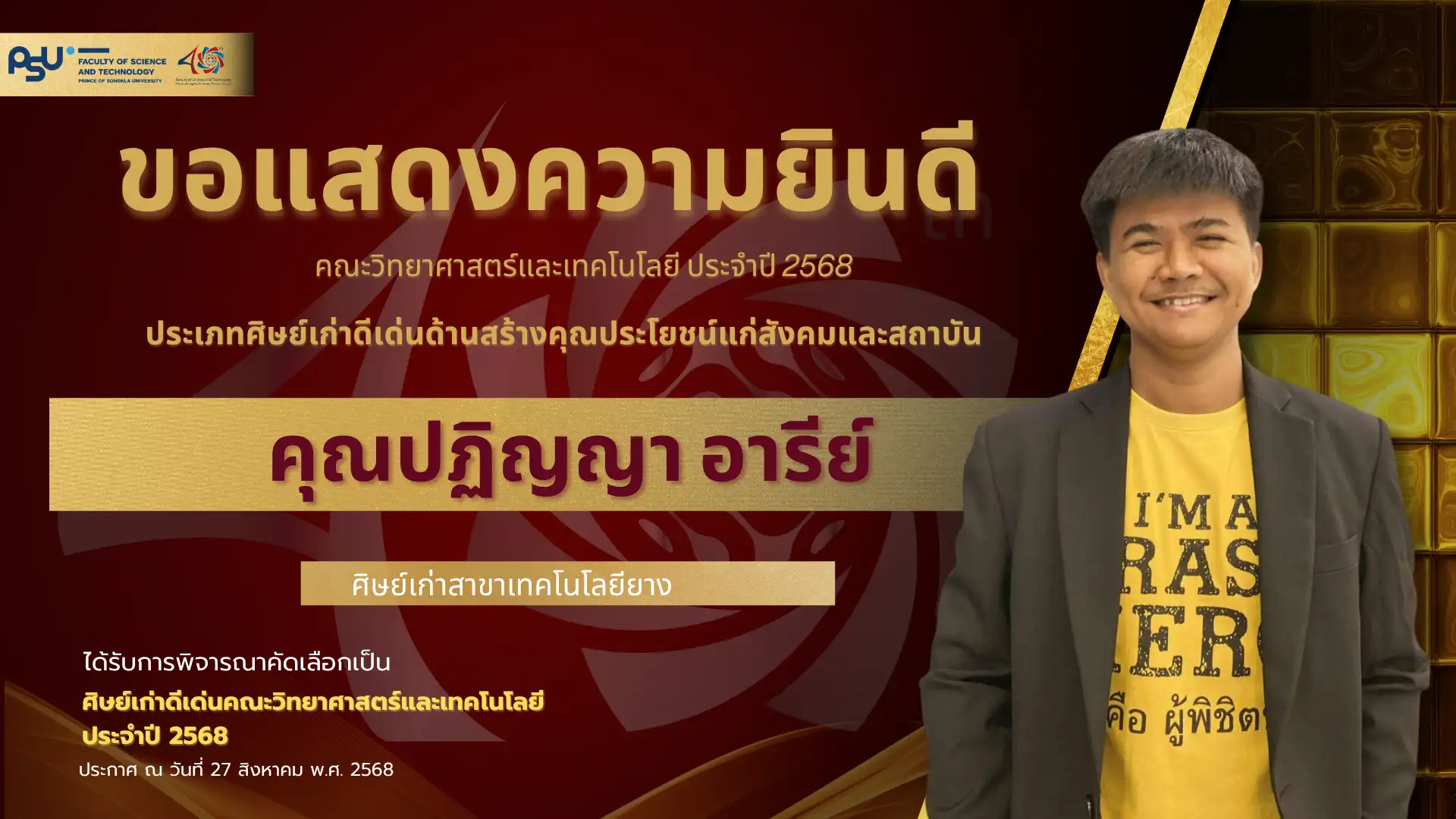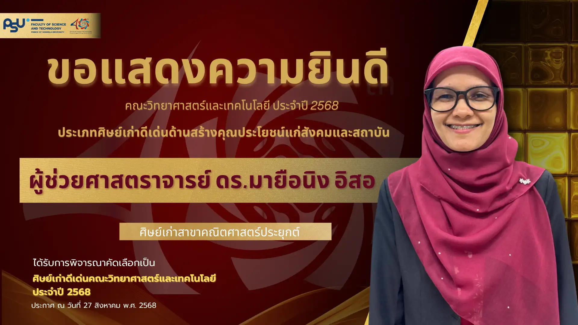 เมื่อวันที่ 4 ตุลาคม 2568 คณะวิทยาศาสตร์และเทคโนโลยี มหาวิทยาลัยสงขลานครินทร์ วิทยาเขตปัตตานี ได้จัดพิธี มอบโล่เกียรติยศศิษย์เก่าดีเด่น ประจำปีพุทธศักราช 2568 ซึ่งเป็นหนึ่งในกิจกรรมเฉลิมฉลอง ครบรอบ 40 ปี แห่งการก่อตั้งคณะวิทยาศาสตร์และเทคโนโลยี เพื่อเชิดชูเกียรติศิษย์เก่าที่มีผลงานโดดเด่นและสร้างคุณประโยชน์แก่สังคม