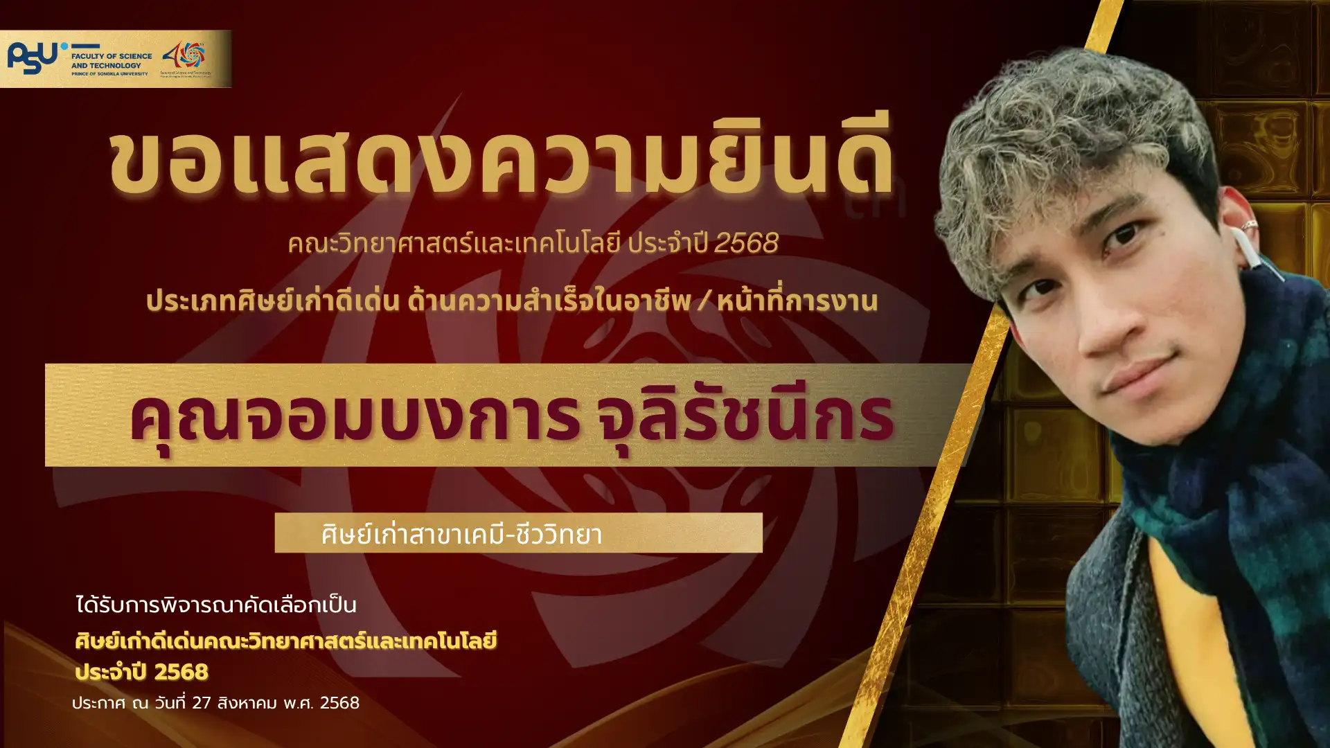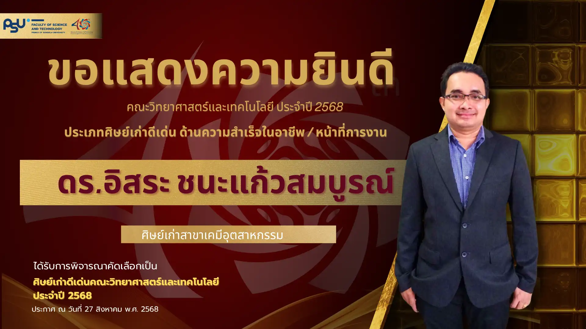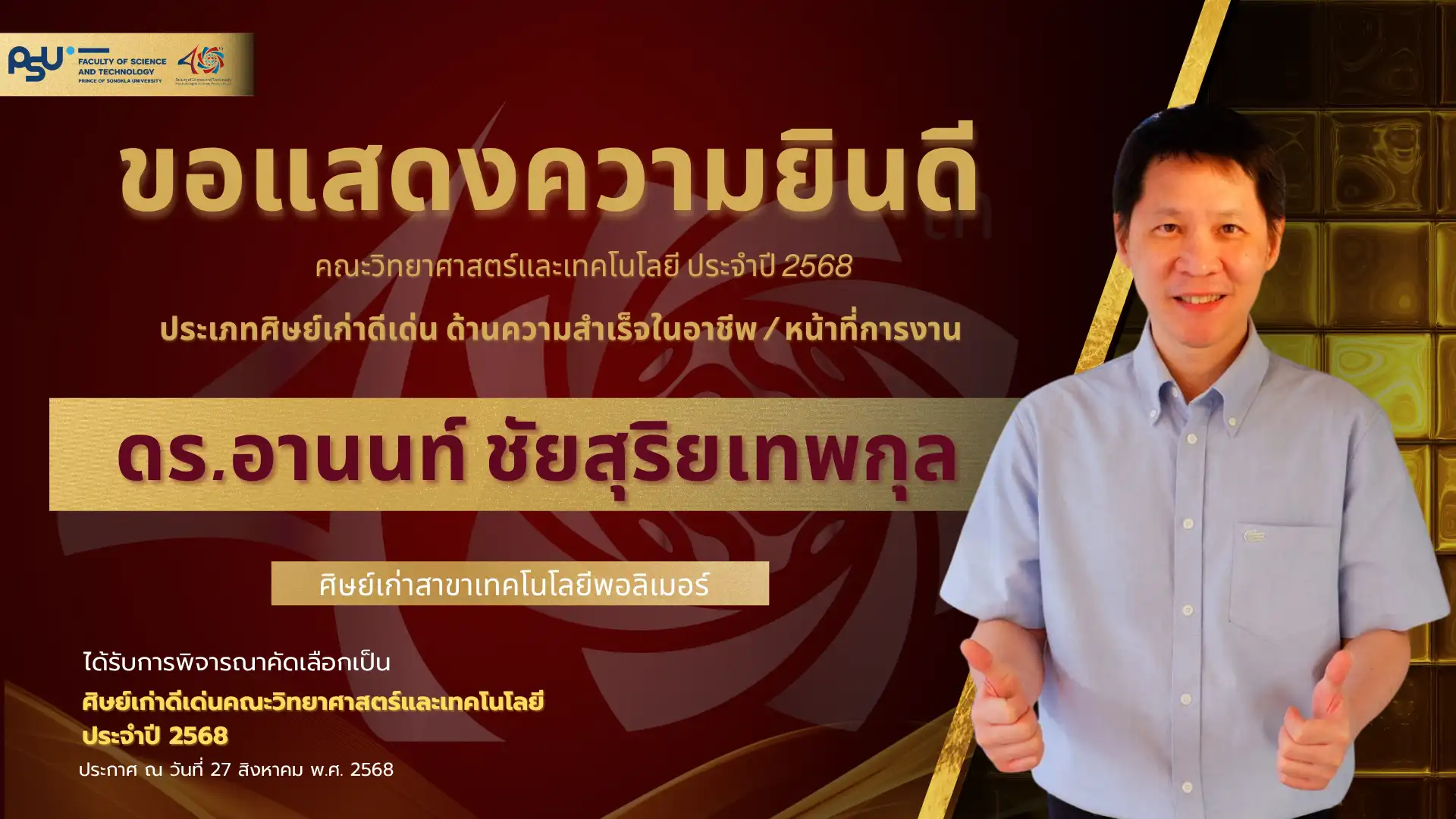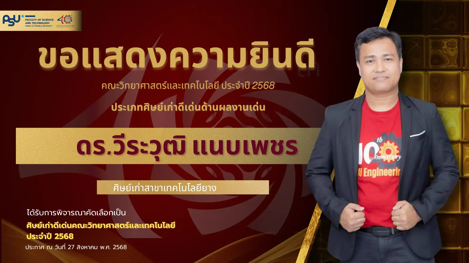 เมื่อวันที่ 4 ตุลาคม 2568 คณะวิทยาศาสตร์และเทคโนโลยี มหาวิทยาลัยสงขลานครินทร์ วิทยาเขตปัตตานี ได้จัดพิธี มอบโล่เกียรติยศศิษย์เก่าดีเด่น ประจำปีพุทธศักราช 2568 ซึ่งเป็นหนึ่งในกิจกรรมเฉลิมฉลอง ครบรอบ 40 ปี แห่งการก่อตั้งคณะวิทยาศาสตร์และเทคโนโลยี เพื่อเชิดชูเกียรติศิษย์เก่าที่มีผลงานโดดเด่นและสร้างคุณประโยชน์แก่สังคม