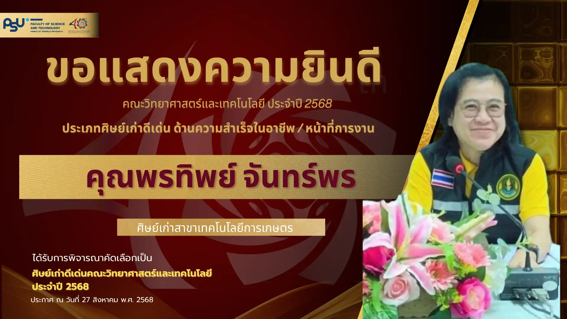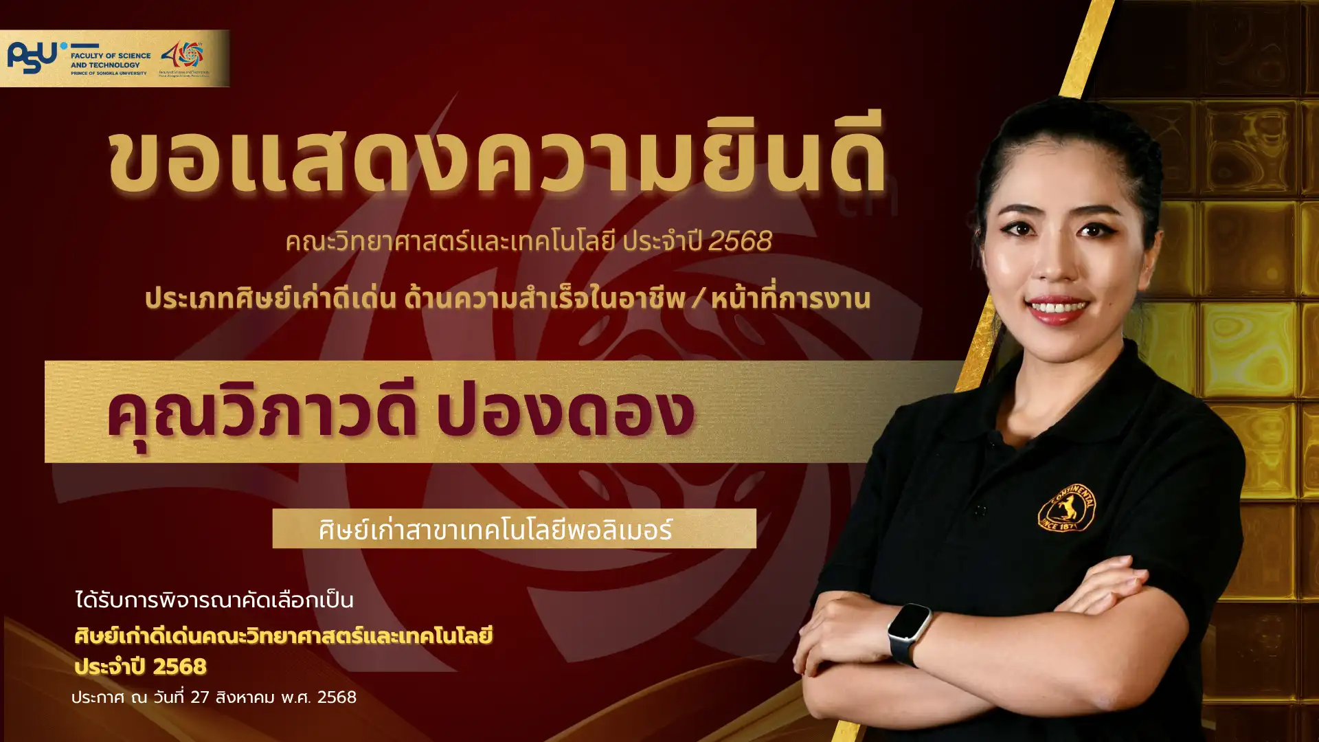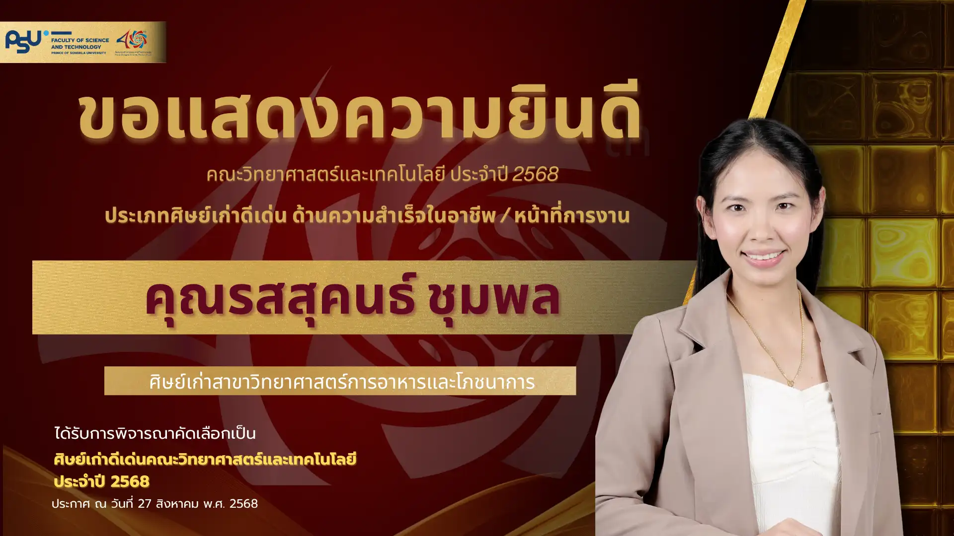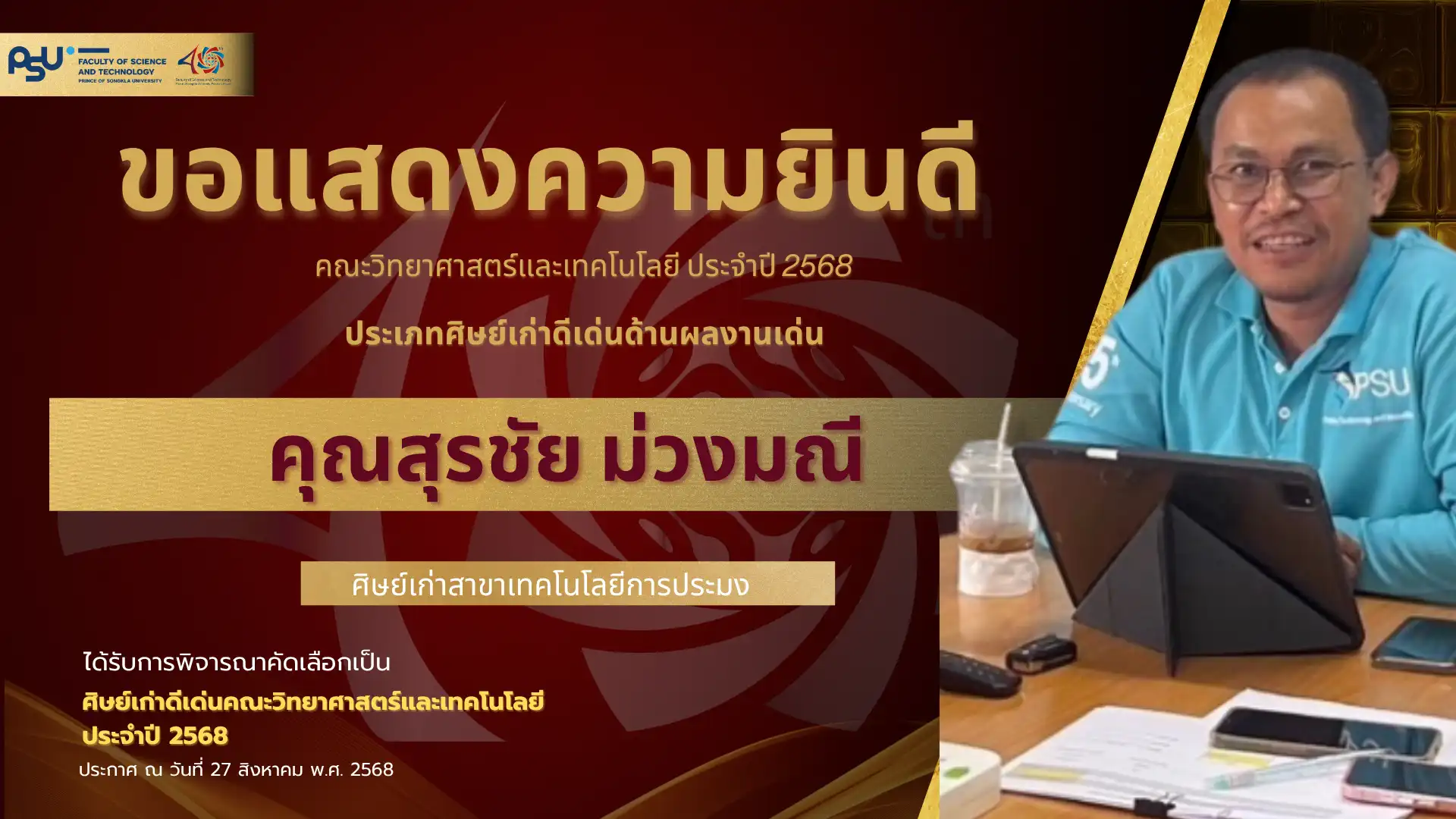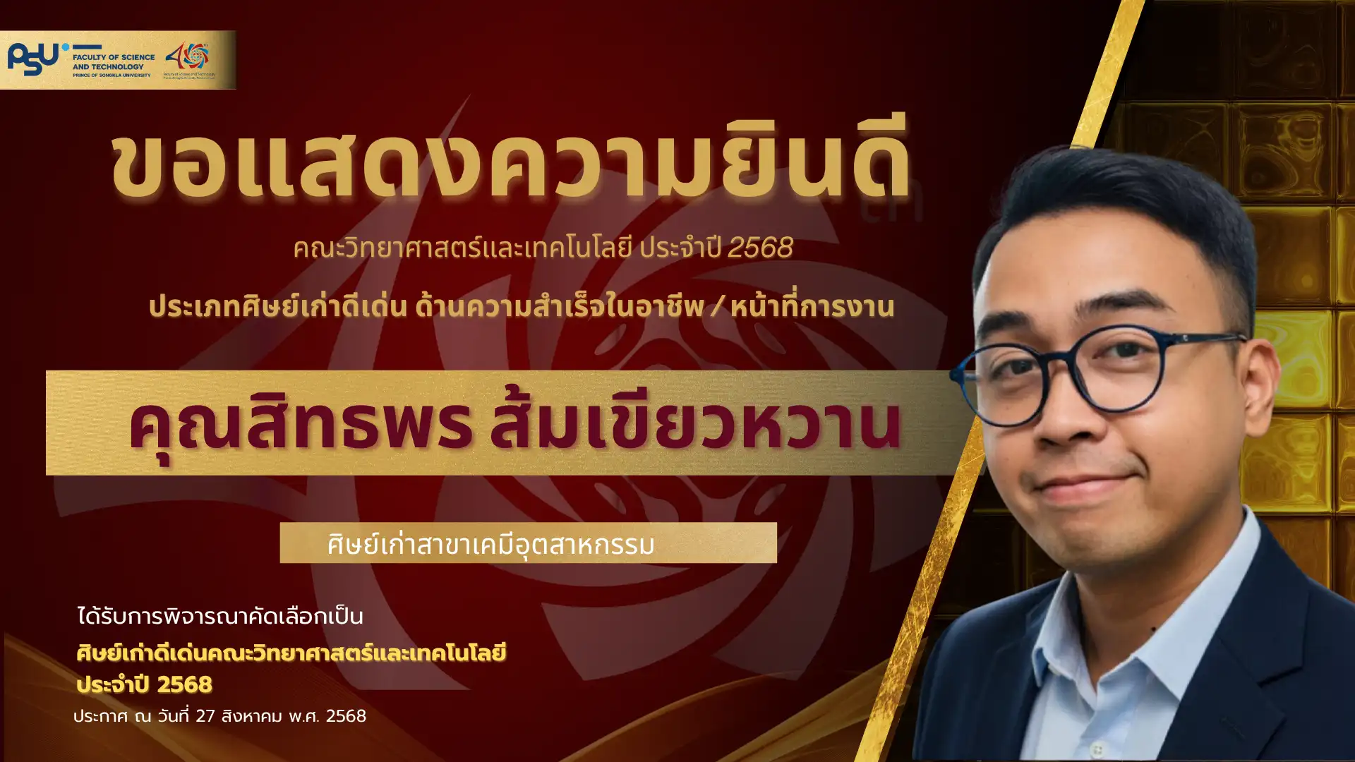 เมื่อวันที่ 4 ตุลาคม 2568 คณะวิทยาศาสตร์และเทคโนโลยี มหาวิทยาลัยสงขลานครินทร์ วิทยาเขตปัตตานี ได้จัดพิธี มอบโล่เกียรติยศศิษย์เก่าดีเด่น ประจำปีพุทธศักราช 2568 ซึ่งเป็นหนึ่งในกิจกรรมเฉลิมฉลอง ครบรอบ 40 ปี แห่งการก่อตั้งคณะวิทยาศาสตร์และเทคโนโลยี เพื่อเชิดชูเกียรติศิษย์เก่าที่มีผลงานโดดเด่นและสร้างคุณประโยชน์แก่สังคม