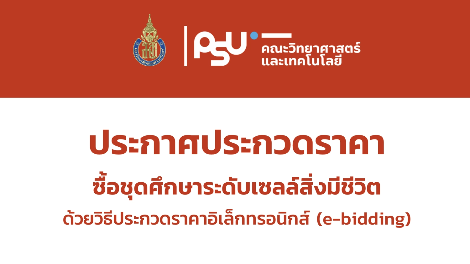 มหาวิทยาลัยสงขลานครินทร์ วิทยาเขตปัตตานี มีความประสงค์จะประกวดราคาซื้อชุดศึกษาระดับเซลล์สิ่งมีชีวิต ประกอบด้วยกล้องจุลทรรศน์แบบสเตอริโอ พร้อมชุดถ่ายภาพและโปรแกรมประมวลผลภาพ 1 ชุด ด้วยวิธีประกวดราคาอิเล็กทรอนิกส์ (e-bidding) ราคากลางของงานซื้อ ในการประกวดราคาครั้งนี้ เป็นเงินทั้งสิ้น 1,520,000.00 บาท (หนึ่งล้านห้าแสนสองหมื่นบาทถ้วน) จำนวน 1 รายการ