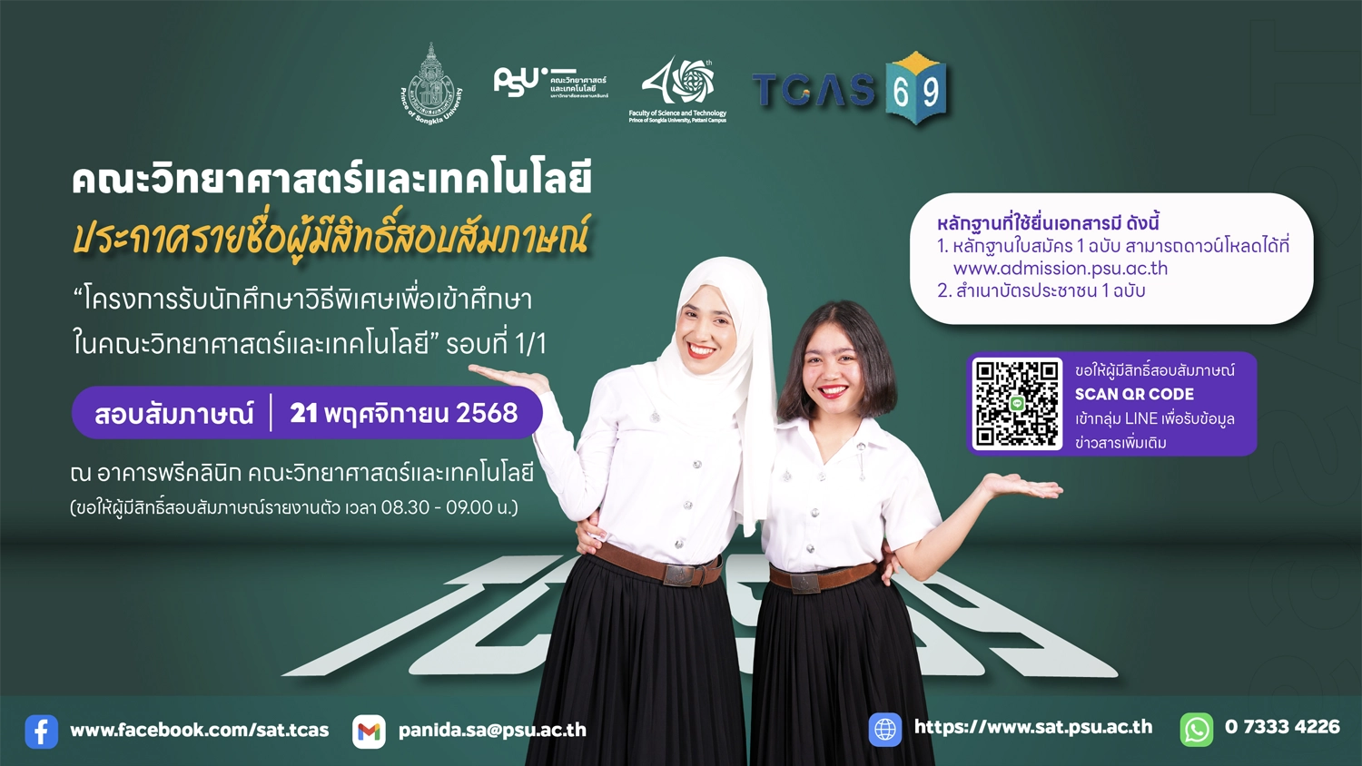 คณะวิทยาศาสตร์และเทคโนโลยี มหาวิทยาลัยสงขลานครินทร์ วิทยาเขตปัตตานี ประกาศรายชื่อผู้มีสิทธิ์สอบสัมภาษณ์ในโครงการรับนักศึกษาวิธีพิเศษ ประจำปีการศึกษา 2569 (รอบที่ 1/1) พร้อมกำหนดการสอบสัมภาษณ์และขั้นตอนสำคัญ ดังนี้